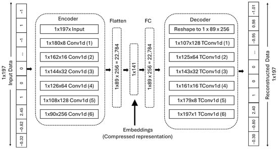 Architecture of the convolutional autoencoder (CAE) for extracting features from one-dimensional (1D) student data. The input consists of a vector containing 197 concatenated features. The encoder consists of six convolutional layers that progressively compress the input dimensions, reducing the raw input to a 141-dimensional latent embedding, which balances information retention and dimensionality reduction. The decoder mirrors the encoder structure, reconstructing the input data with minimal information loss. “Conv1d” denotes 1D convolutional layers applied along the feature axis; for example, “1 × 180 × 8” indicates batch size = 1, input length = 180, and 8 channels. “FC” refers to a fully connected layer used to reshape the latent embedding, and “TConv1d” indicates transposed 1D convolutions for upsampling in the decoder.