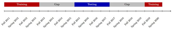 Illustration of the two-year gap strategy used to create training and testing sets for cross-validation. The testing set (blue) represents a sequence of consecutive semesters separated from the training set (red) by a two-year gap (gray). By shifting these sets along the timeline, multiple folds (configurations) are created to support cross-validation, simulating real-world scenarios where predictions must generalize to unseen data. In some configurations, specific semesters (e.g., Fall 2011, Spring 2012, Fall 2019, Spring 2020) were excluded to maintain balance across folds.