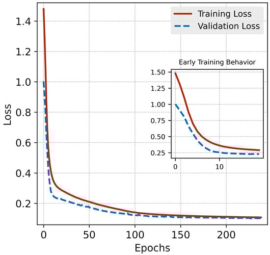 Training and validation loss curves for the convolutional autoencoder (CAE), illustrating the learning process and convergence. The curves demonstrate steady improvement and alignment, indicating effective generalization without overfitting. Early stopping, marked on the plot, highlights the model stabilization point. The inset provides a closer look at the initial training phase, showcasing the rapid decline in loss as the model begins to learn. These results confirm the ability of the CAE to capture meaningful patterns in the data and reconstruct input with high fidelity, making it a reliable tool for dimensionality reduction and feature extraction.