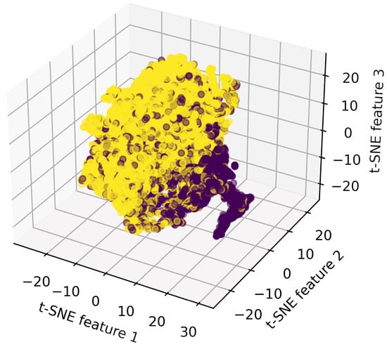 Three-dimensional t-SNE visualization of encoded features from the test set, illustrating the structure of the data in the latent space. The visualization reveals distinct clusters, with colors representing different labels, graduates are purple and non-graduates are yellow. While some overlap between clusters is observed, likely reflecting shared characteristics across groups, the embeddings effectively capture broad distinctions between the labels. This visualization highlights the potential of the convolutional autoencoder for dimensionality reduction and its applicability to downstream predictive tasks.