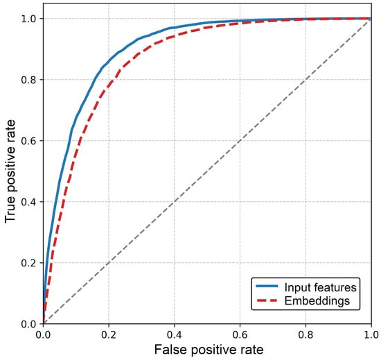 Comparison of receiver operating characteristic (ROC) curves for classification performance using input data and autoencoder-extracted embeddings. The solid blue line shows performance with the original input features, the dashed red line represents the 141-dimensional embeddings, and the diagonal gray line indicates random classifier performance. The input features achieve higher overall performance; however, the embeddings demonstrate their value as a compact representation that effectively preserves essential patterns in the data.