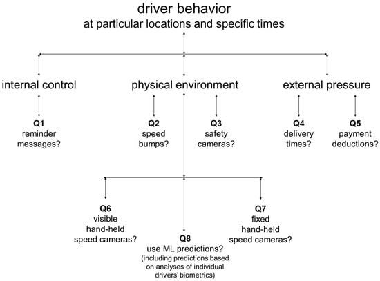 The sixth (Q6), seventh (Q7), and eighth (Q8) questions are concerned with more sophisticated design of the physical environment. Q6 is as follows: Should the local government road traffic department deploy local officials with hand-held speed cameras at roadside locations, where they can be seen from a far distance by drivers, or where they cannot be seen from a far distance by drivers? Q7 is as follows: Should the local government road traffic department deploy local officials with hand-held speed cameras at roadside locations, which are always the same locations, or which are at locations that often change? Q8 is as follows: Should the local government road traffic department deploy local officials with hand-held speed cameras at roadside locations who can access machine learning predictions of where road traffic regulations violations are most likely to happen, or who can access machine learning predictions of which delivery drivers are most likely to violate road traffic regulations?