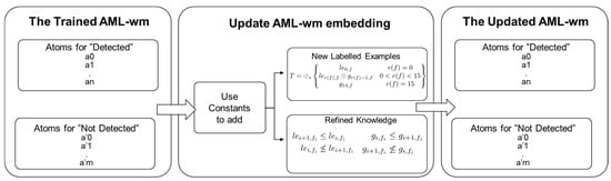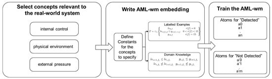 Training of algebraic machine learning (AML) models is explained in detail in []. The diagram in Figure 4 summarizes the three stages of model formulation. First, select concepts relevant to the real-world system. The main concepts are internal control, physical environment, and external pressure. The second stage is writing the embedding by defining constants for the main concepts. This is performed through labeled examples in datasets, which, in this case, are datasets for driver fatigue, and through the definition of domain knowledge, which, in this case, encompasses external pressure and physical environment. The third step is the training of the machine learning model.