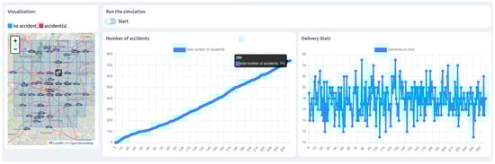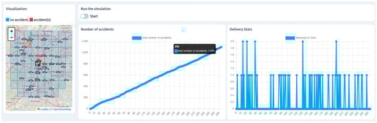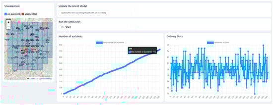 Figure 6 shows an example of real-time visualization of consequences when the first option is chosen for all eight questions. From left to right, the visualization shows the locations of accidents on a grid map, the number of accidents in relation to the number of simulation iterations, and delivery statistics in relation to the number of simulation iterations. Figure 6 shows two map grids where accidents are predicted to be most likely to occur. Also, Figure 6 shows that 742 accidents are predicted to occur based on 256 simulation iterations, while the number of on-time deliveries per iteration varies between 11 and 25.