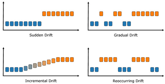 As already mentioned, technological advancements have brought forth a new era in data mining and machine learning research; one where algorithms must be able to adapt to ever-evolving data streams. Click-through data, social media outputs, financial micro-transactions, and even IoT sensor data are only a few of the example applications that generate large amounts of data at high velocity [18]. In this context, a significant challenge faced by traditional (batch) machine learning models is that the distribution of the incoming data may shift at some point, e.g., a new product launch may significantly change the buying behavior of consumers, unexpected news may alter the stock price of a company, etc. These types of changes in distribution are commonly referred to as drifts [3,4]. Drifts can take various forms, as shown in Figure 1.