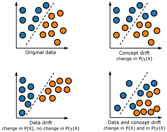 Another important distinction can be made based on the variables that are affected by the distribution change. In current literature, the two main categories of drifts recognized are concept drifts and data drifts [3,4], as shown in Figure 2 (current literature also provides other names for these drifts; e.g., data drifts are sometimes referred to as virtual drifts or feature drifts, while concept drifts are also known as label drifts [5]). In the context of a classification scenario, concept drifts signify changes in the correlation between the input variables (X) and the target output (y), i.e., a shift in the conditional distribution . As a result, the decision boundary initially learned by the model becomes outdated and must be adjusted to reflect the new concept (see top-right panel of Figure 2). Data drifts, on the other hand, signify changes in the input data features (i.e., in the distribution ), which may or may not affect the model’s output; thus, the classifier’s decision boundary may or may not still be valid (see bottom two panels of Figure 2).