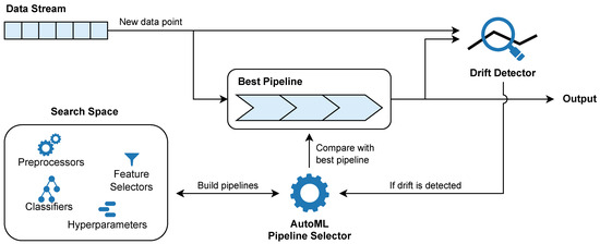 The aforementioned approaches attempt to solve the problem of the occurrence of drifts in evolving data streams; however, their main drawback is the requirement of manual configuration. Moreover, those algorithms may be effective on certain data streams, but they do not generalize well to others due to the fact that they are limited by the specifics of each classification algorithm. As a result, recently, several researchers have attempted to design AutoML approaches for evolving data streams [12,13,15,16,17]. AutoML is a field of machine learning that aspires to automate model selection and hyperparameter optimization, thus providing a configuration that is effective on a variety of data. In the context of online learning, AutoML models are typically coupled with drift detection mechanisms.