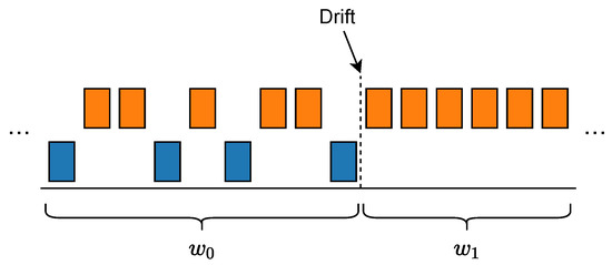 In order for AML4S to identify both concept drifts and data drifts, we create a detector consisting of two components: one for concept drift detection and one for data drift detection. Since the focus of this work is not drift detection explicitly, but rather providing a unified, online AutoML solution, both parts employ ADWIN [20], a drift detection algorithm that is well-established, highly adaptive, and can detect different types of drifts such as those indicated in Figure 1. Contemporary research has shown that it can be effective both for data and for concept drifts [27,28]. The algorithm relies on a variable-length sliding window w, which continuously consumes the arriving data instances. ADWIN then splits the window into two consecutive sub-windows, and . An example binary concept scenario is shown in Figure 4.
