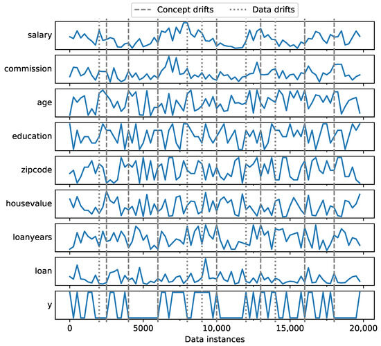 Figure 7 provides a visualization of the dataset for a scenario of 2 classes, including the drifts defined in Table 4. The diagram depicts 20,000 data instances, including all features, as well as the target variable (y). Concept drifts are noted with a dashed line, while data drifts are noted with a dotted line. It is interesting to note that the distribution of salary indeed changes when a data drift occurs.