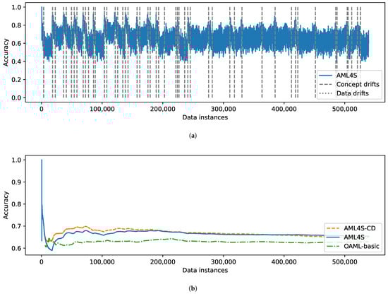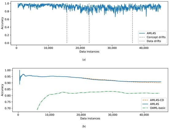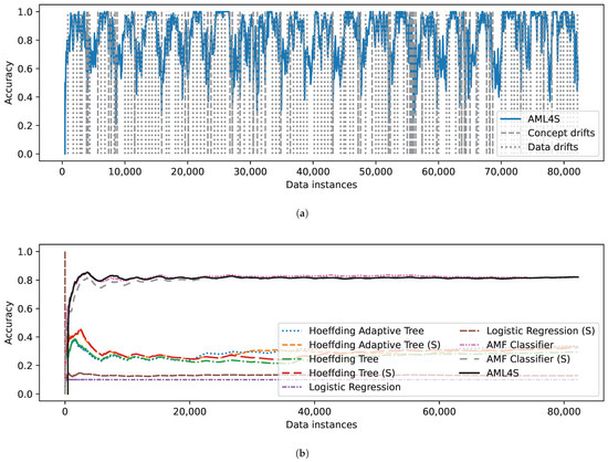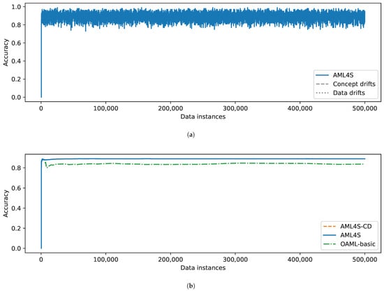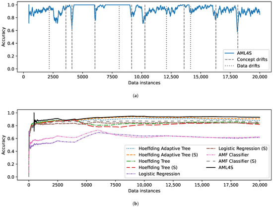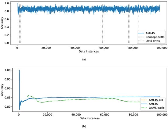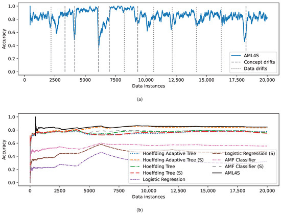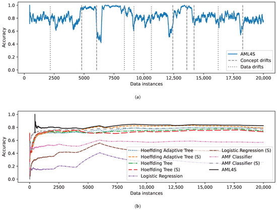 We conducted three experiments, one for each dataset of Section 4.1 (2 classes, 3 classes, 4 classes), while always using a memory of 450 samples. To make the comparison as comprehensive as possible, we employ the accuracy metric. However, since we are comparing online models, we compute what we may call the model’s moving accuracy, i.e., the accuracy of the last 100 instances, and the moving average accuracy, i.e., the aggregated accuracy of the model from the start to a certain data instance. The results for the binary classification problem are shown in Figure 8. Figure 8a depicts the moving accuracy of AML4S, including the different types of drifts. Interestingly, we may note how our method is quick to adapt to drifts, as its accuracy quickly recovers (within a few data instances, enough to train the new pipelines of AML4S), even after feature distribution shifts.