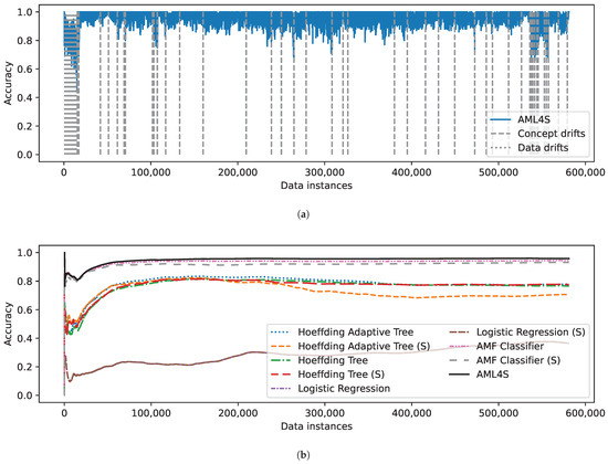 To ensure that AML4S is effective, we compare it with several state-of-the-art online models provided by the River framework [26], specifically with Hoeffding Adaptive Tree, Hoeffding Tree, Logistic Regression, and the Aggregated Mondrian Forest (AMF) Classifier. These algorithms were chosen because they provide coverage on a plethora of learning criteria; Logistic Regression is a linear model, functioning as a baseline. Hoeffding Tree and the AMF Classifier are based on online tree and forest implementations, respectively, which are known to be effective for online learning. Hoeffding Adaptive Tree is an adaptive method that further integrates an ADWIN drift detector; hence, it shall provide an interesting comparison to our pipeline. Finally, these models were also evaluated in conjunction with the Standard Scaler provided by River to further assess the effect of preprocessing.