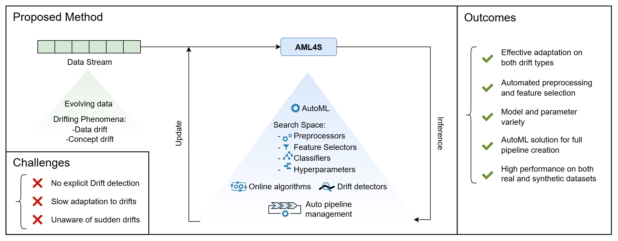 Although the aforementioned approaches are effective under specific scenarios, they also have certain limitations. First of all, the approaches that do not employ drift detection methods may not be a good fit for data streams with abrupt changes in the distribution of the data, as they might only adapt to gradual drifts. Other approaches focus only on concept drifts, not adapting the models preemptively in the case of data drifts. Concerning adaptability, online machine learning methods may need manual configuration to optimize their parameters. In contrast, AutoML methods are optimized automatically, although they often lack preprocessing algorithms, and they are sometimes limited by the types of classification models used (e.g., some support only one category of classification models and are thus mainly focus on hyperparameter optimization). Moreover, certain approaches have to wait for multiple batches of data to arrive before initialization, as they base their retraining on large time windows. Finally, certain implementations are not available online and/or do not employ state-of-the-practice libraries.