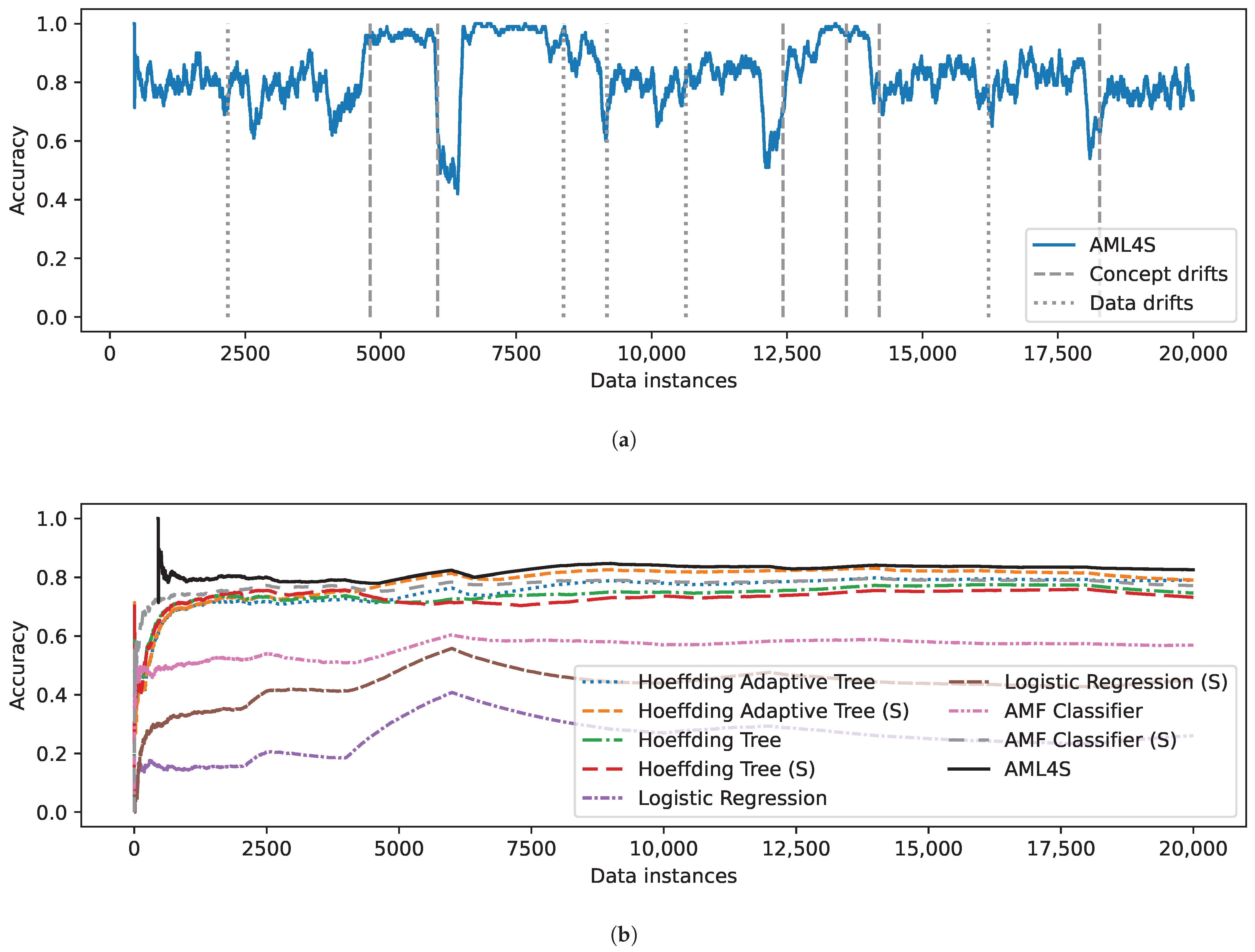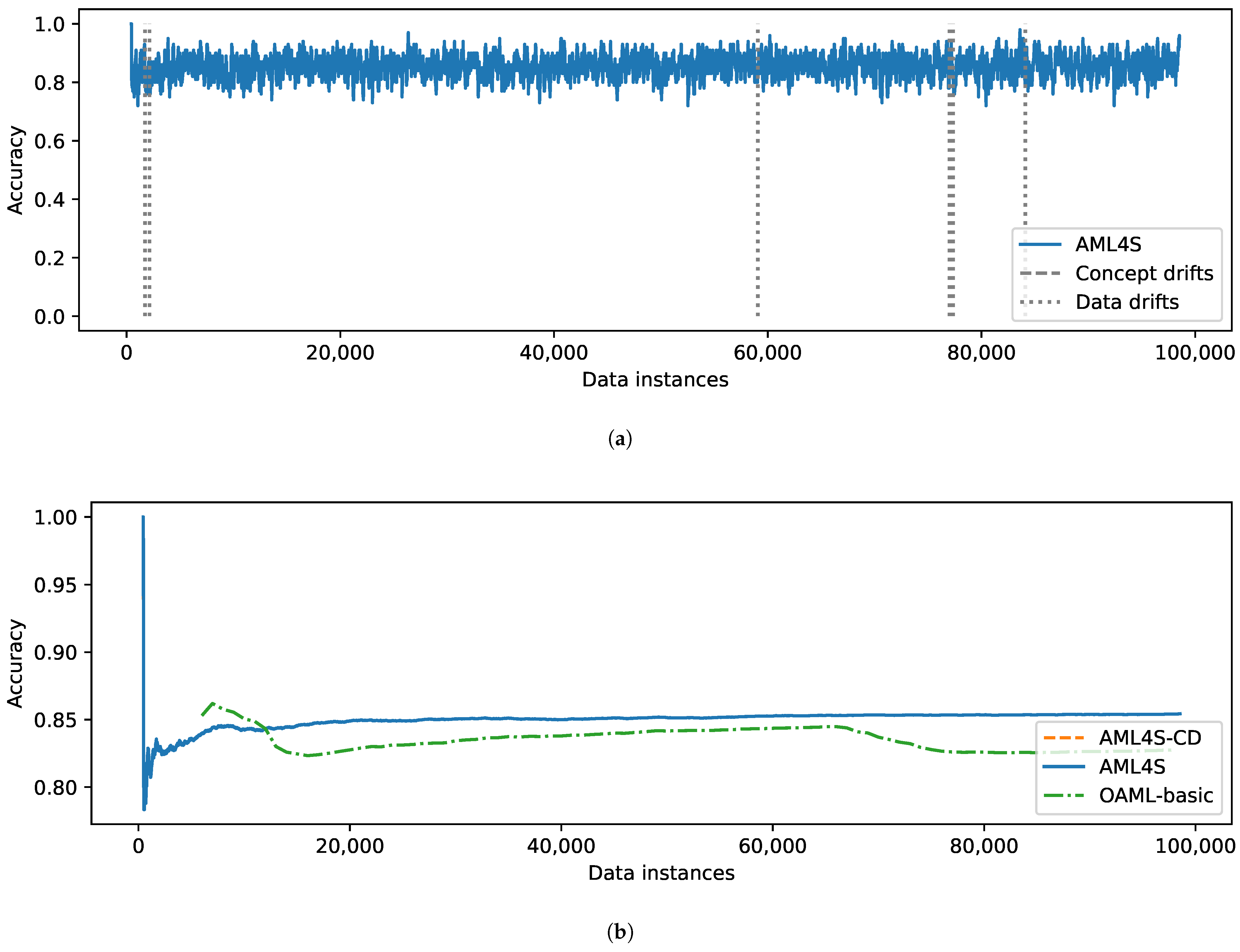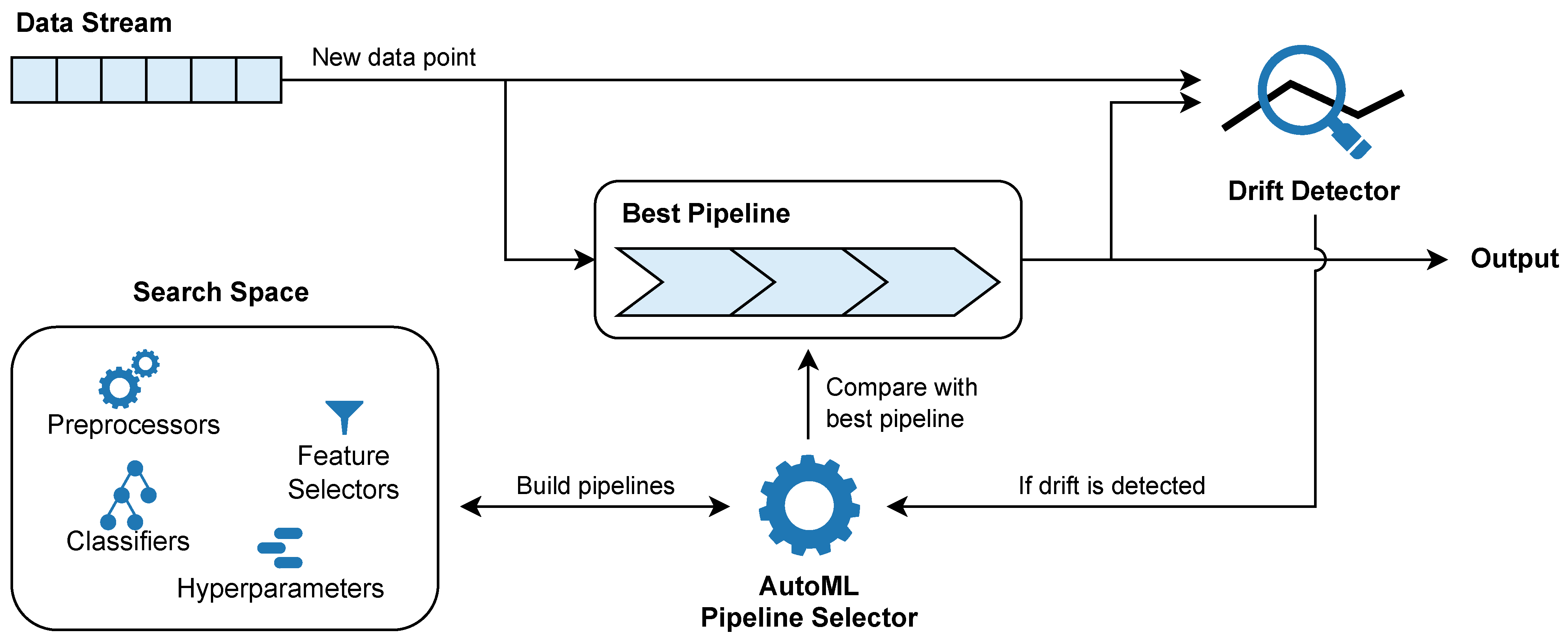 17]. AutoML is a field of machine learning that aspires to automate model selection and hyperparameter optimization, thus providing a configuration that is effective on a variety of data. In the context of online learning, AutoML models are typically coupled with drift detection mechanisms.