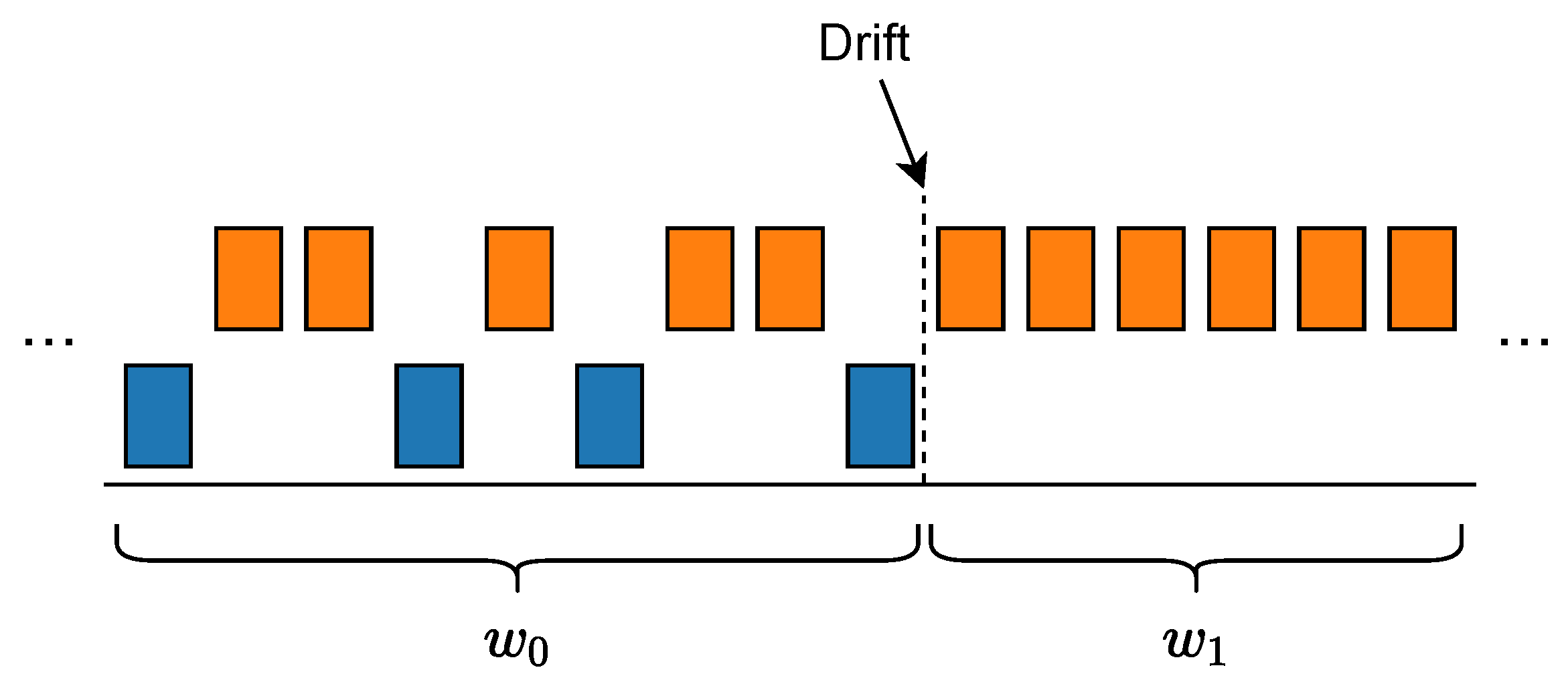 They can be sudden, where the distribution changes drastically in a small time frame, usually in response to an unexpected event, or the distribution can change gradually due to the inertia of the scenario, with the two distributions coexisting temporarily, (e.g., a new popular framework may replace another older one in user preference). Incremental drifts are also similar; however, they occur in cases where there is no clear transition between the two underlying data distributions, but rather the shift happens progressively and continuously (e.g., electricity/gas use throughout the autumn and winter months when the weather becomes progressively colder). Finally, a drift can even be reoccurring, meaning that previously observed distributions reappear occasionally, which is a common response to external changes that keep appearing at different points in time (e.g., a weather event may change the traffic conditions whenever it happens).