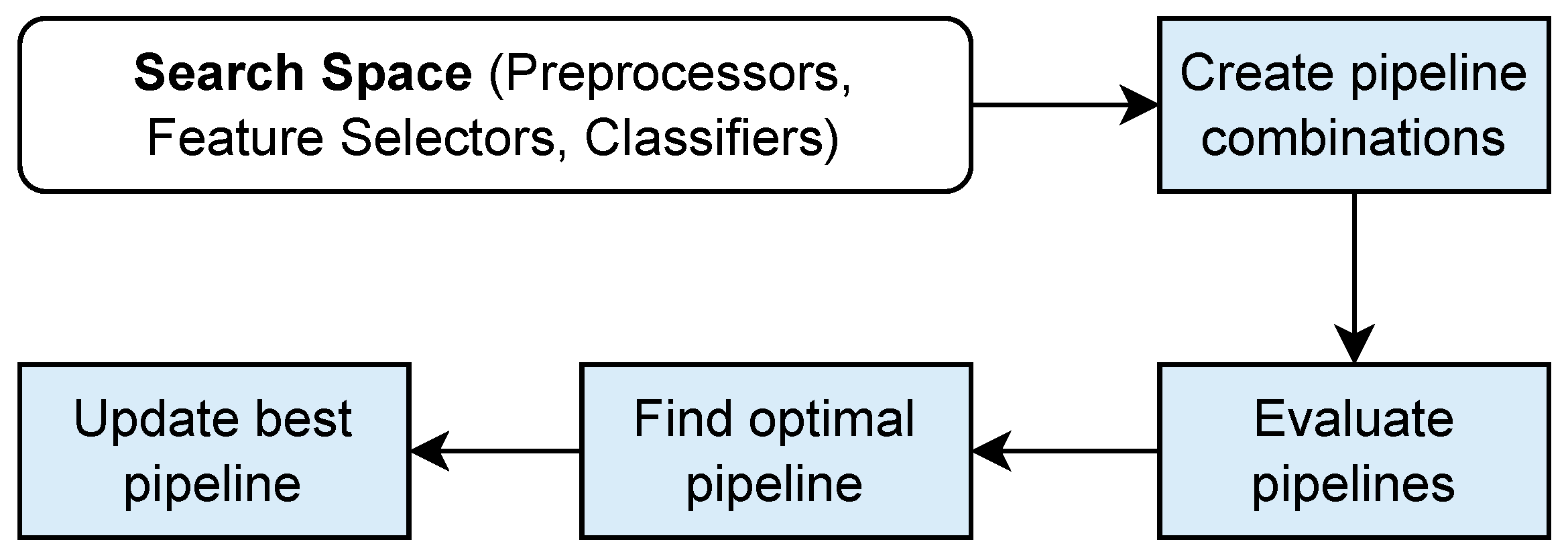 40] seem to be promising options, since they offer effective and efficient pipeline-building. The former focuses on efficiently navigating the algorithm search space (preventing resource allocation to suboptimal configurations), while the latter allows for simultaneous evaluation of multiple configurations. Furthermore, we aim to expand our search space by including more preprocessing techniques and/or classification algorithms. It would be interesting to further explore the effectiveness of ensemble/deep learning methods [