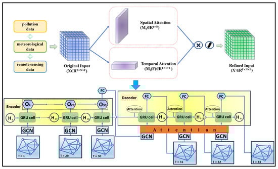 - The Spatio-Temporal Graph Convolutional Network with Attention Mechanism (STGCA) model is proposed, which is designed based on a seq2seq framework, and is able to effectively capture the complex dependencies of PM2.5 concentration in both spatial and temporal dimensions by combining GCN and GRU. GCN processes the non-Euclidean spatial features for accurately modeling spatial correlations among different regions, while the GRU models time series information to capture the long-term and short-term temporal dynamics.