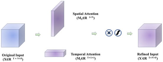 - The spatio-temporal matrix is then processed by the attention module. This module contains two parts, spatial attention and temporal attention, which are used to assign spatial and temporal weights to the data.