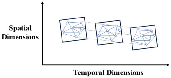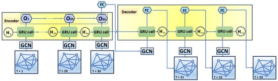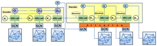 - The core of our temporal modeling component is the GC-GRU cell. This module enhances the conventional GRU structure by making its gating mechanisms spatially aware. Instead of standard matrix multiplications, graph convolution operations () are integrated into the update and reset gates. This modification allows each GRU to aggregate information not only from its own past state but also from its spatial neighbors at the current time step, thereby learning a unified spatio-temporal representation.The candidate hidden state is then calculated using the reset gate to modulate the influence of the previous hidden state:Finally, the new hidden state is produced by the update gate, which balances information from the previous state and the current candidate state:where is the input feature matrix at time t, and is the hidden state from the previous time step. The symbol denotes the graph convolution operation [50], is the Sigmoid activation function, and ⊙ represents the element-wise (Hadamard) product. The terms are the learnable weight matrices for their respective gates.