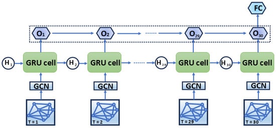 - Series connection of loop units: all GC-GRU cells are connected in series in chronological order, and the output of each unit is used as the input of the next unit to ensure the temporal continuity. With this structural design, the model is able to process inputs from different time steps and gradually establish global temporal dependencies. Figure 11 illustrates the architecture of the GC-GRU network.