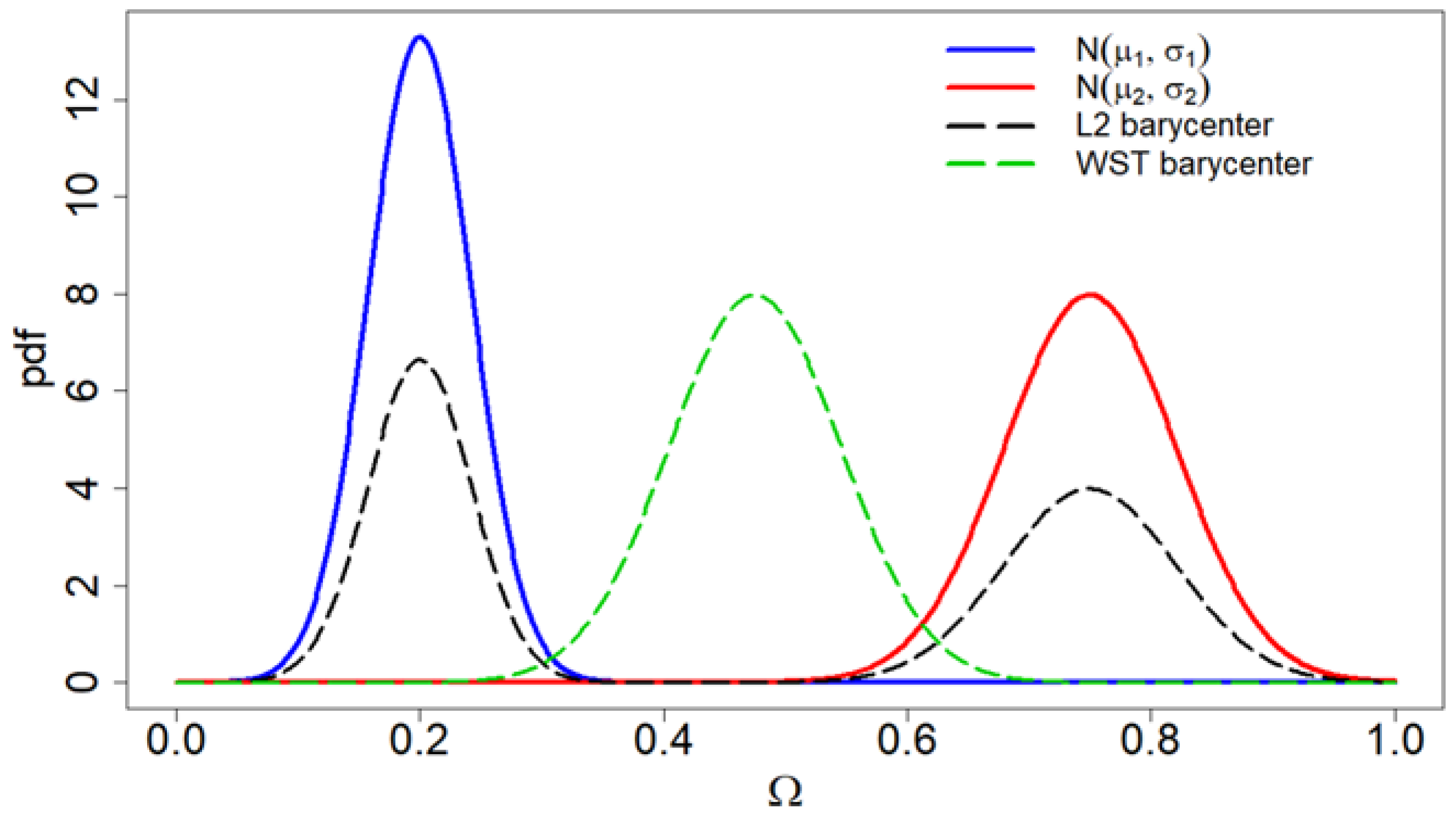 Figure 1 provides a practical and simple example showing the difference between the Wasserstein Barycenter of two (equally weighted) normal distributions and the L2-norm barycenter obtained by considering, as the distance, the L2-norm between the probability density functions aligned on the support. The shape preservation guaranteed by the Wasserstein Barycenter is clearly visible: it is normal, instead of bimodal.