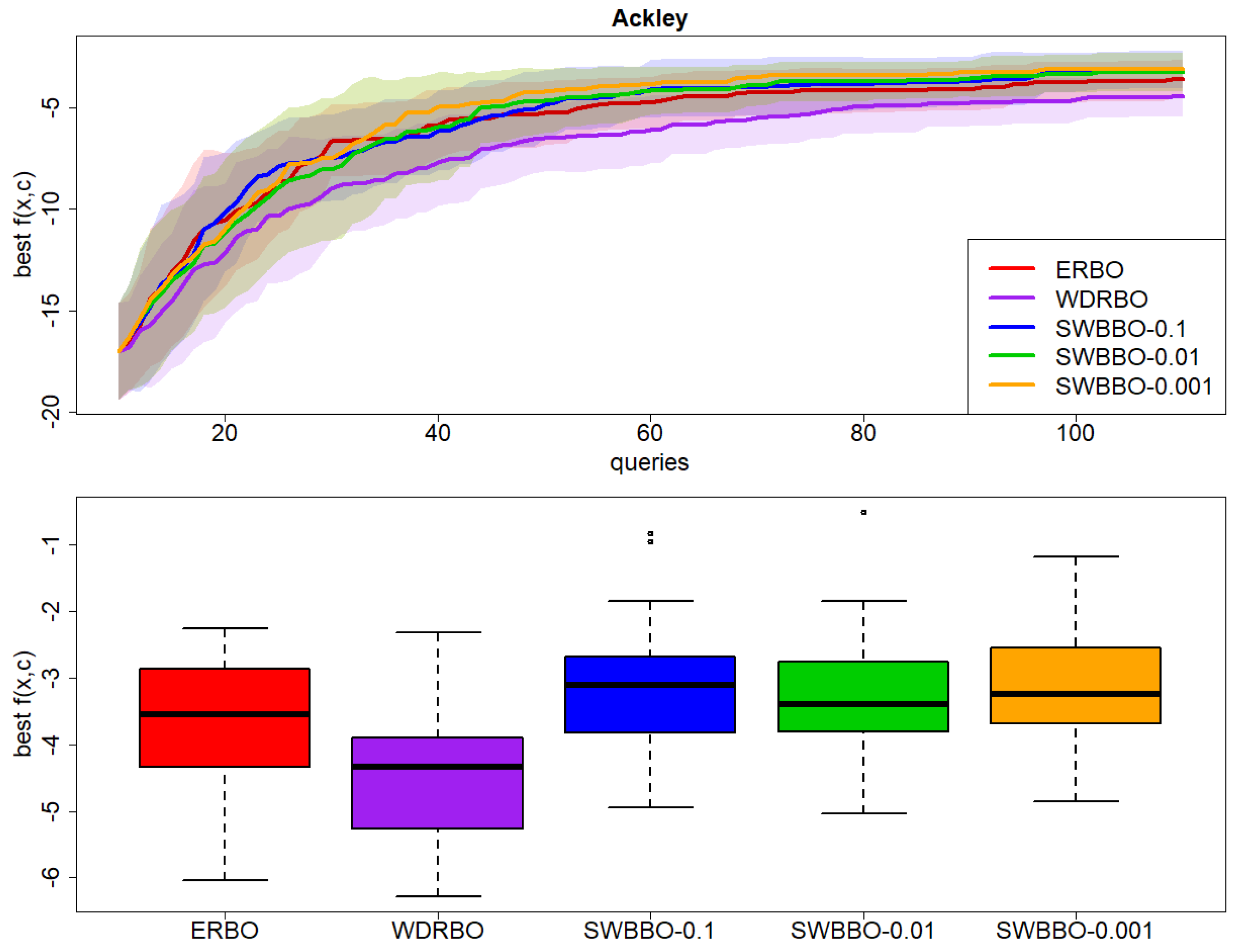 Results on Ackley over 30 independent runs: (top) best observed value of with respect to BO queries and (bottom) boxplot of the final best value of .