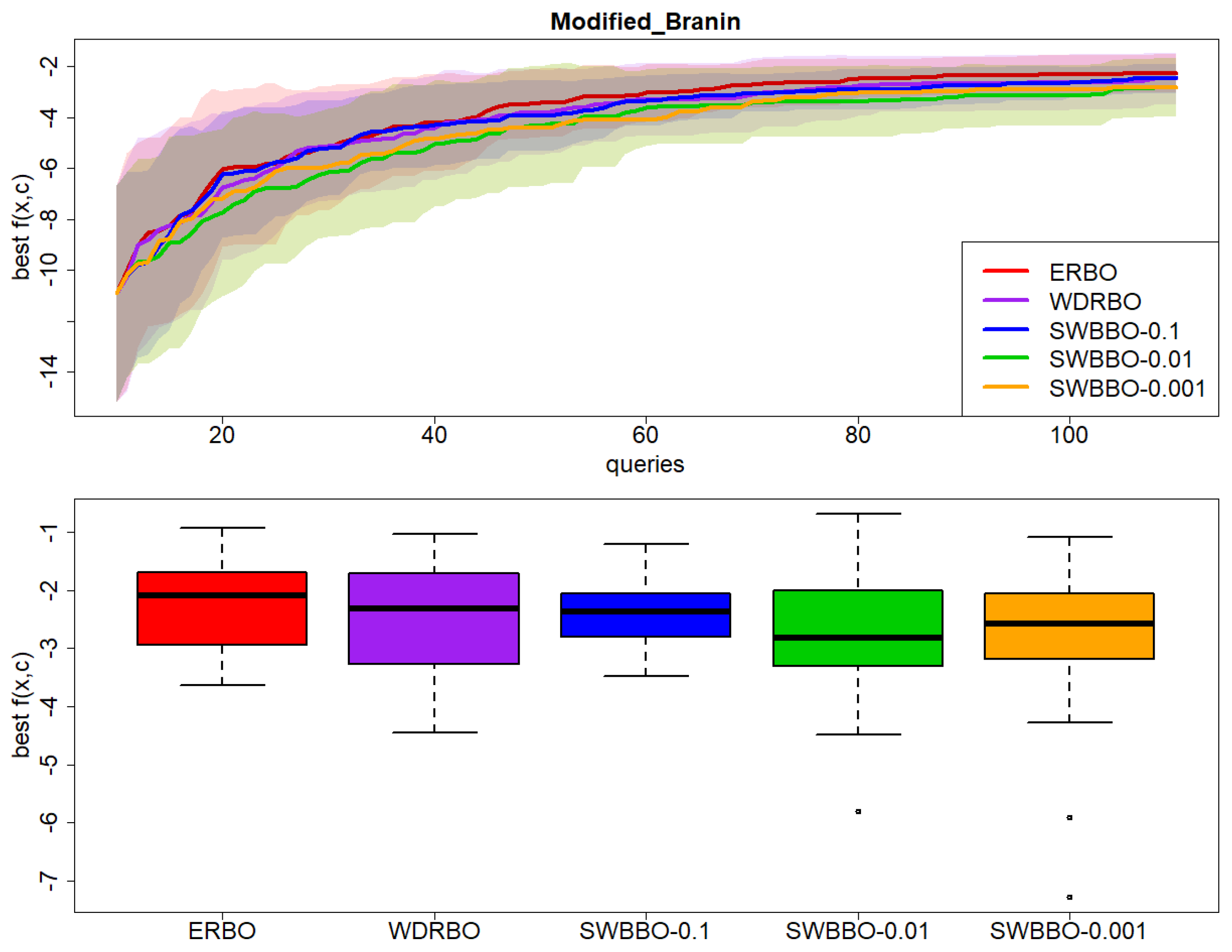 Results on Modified_Branin over 30 independent runs: (top) best observed value of with respect to BO queries and (bottom) boxplot of the final best value of .