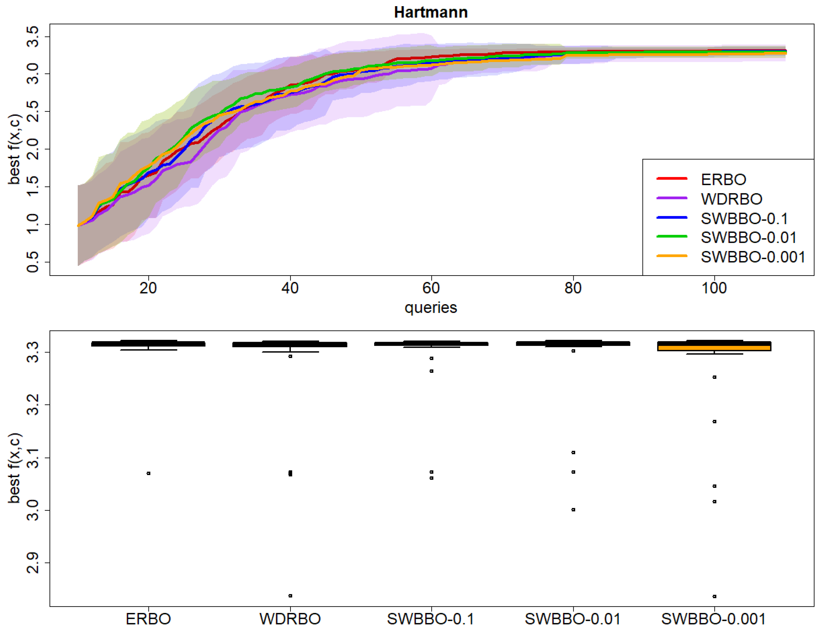 Results on Hartmann over 30 independent runs: (top) best observed value of with respect to BO queries and (bottom) boxplot of the final best value of .