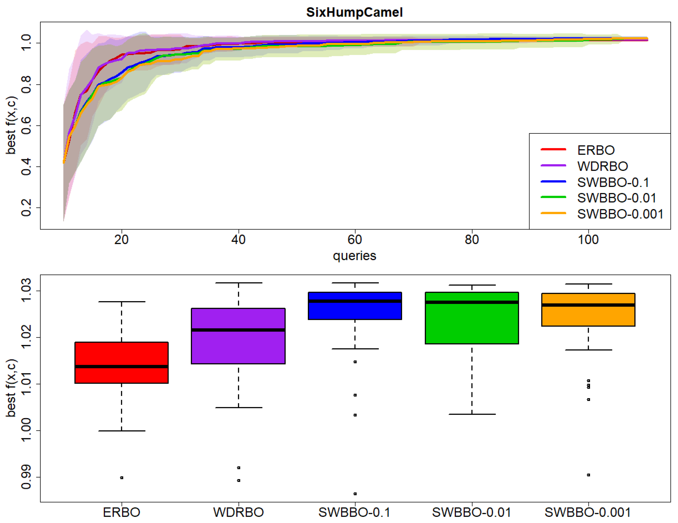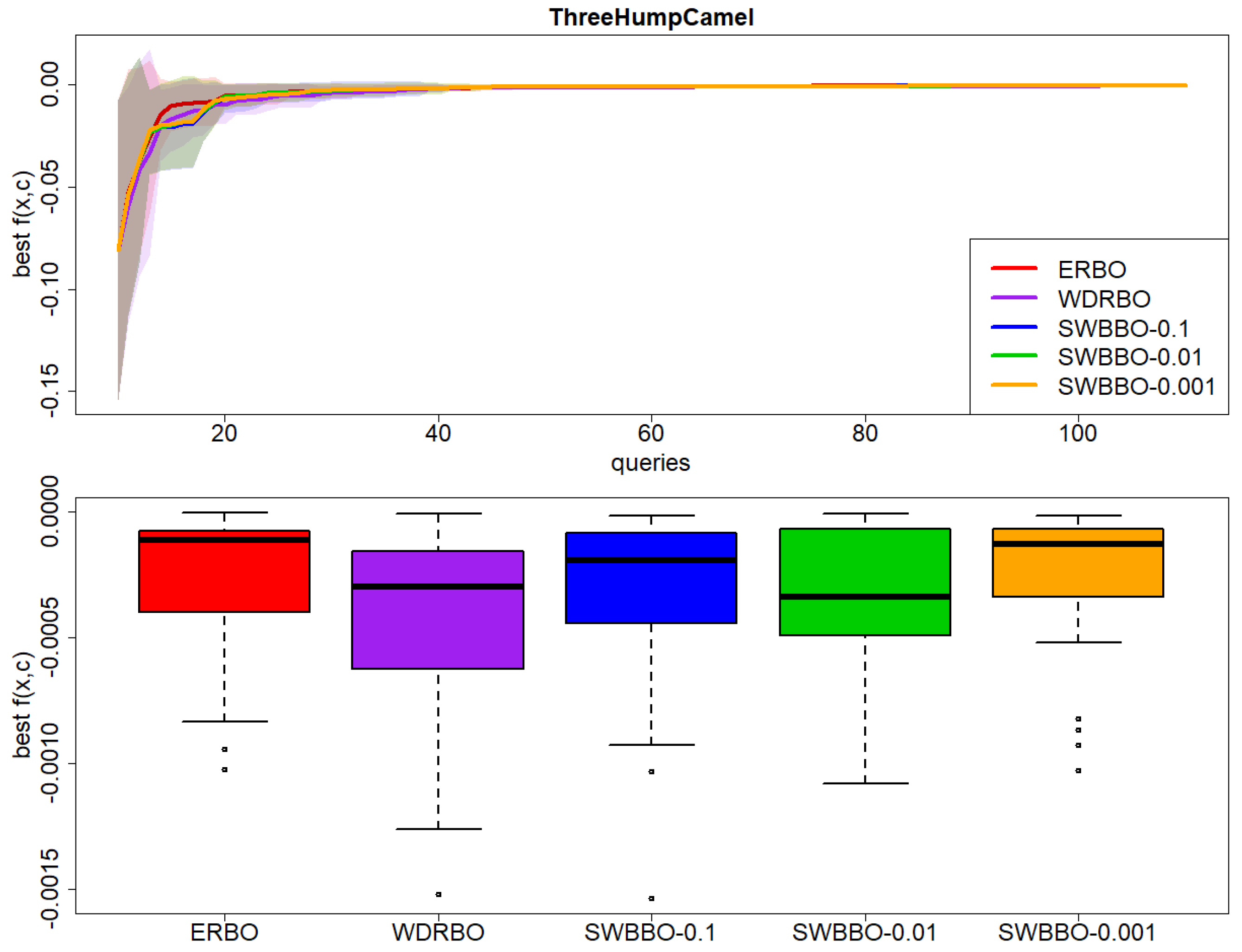 Results on Three Hump Camel over 30 independent runs: (top) best observed value of with respect to BO queries and (bottom) boxplot of the final best value of .