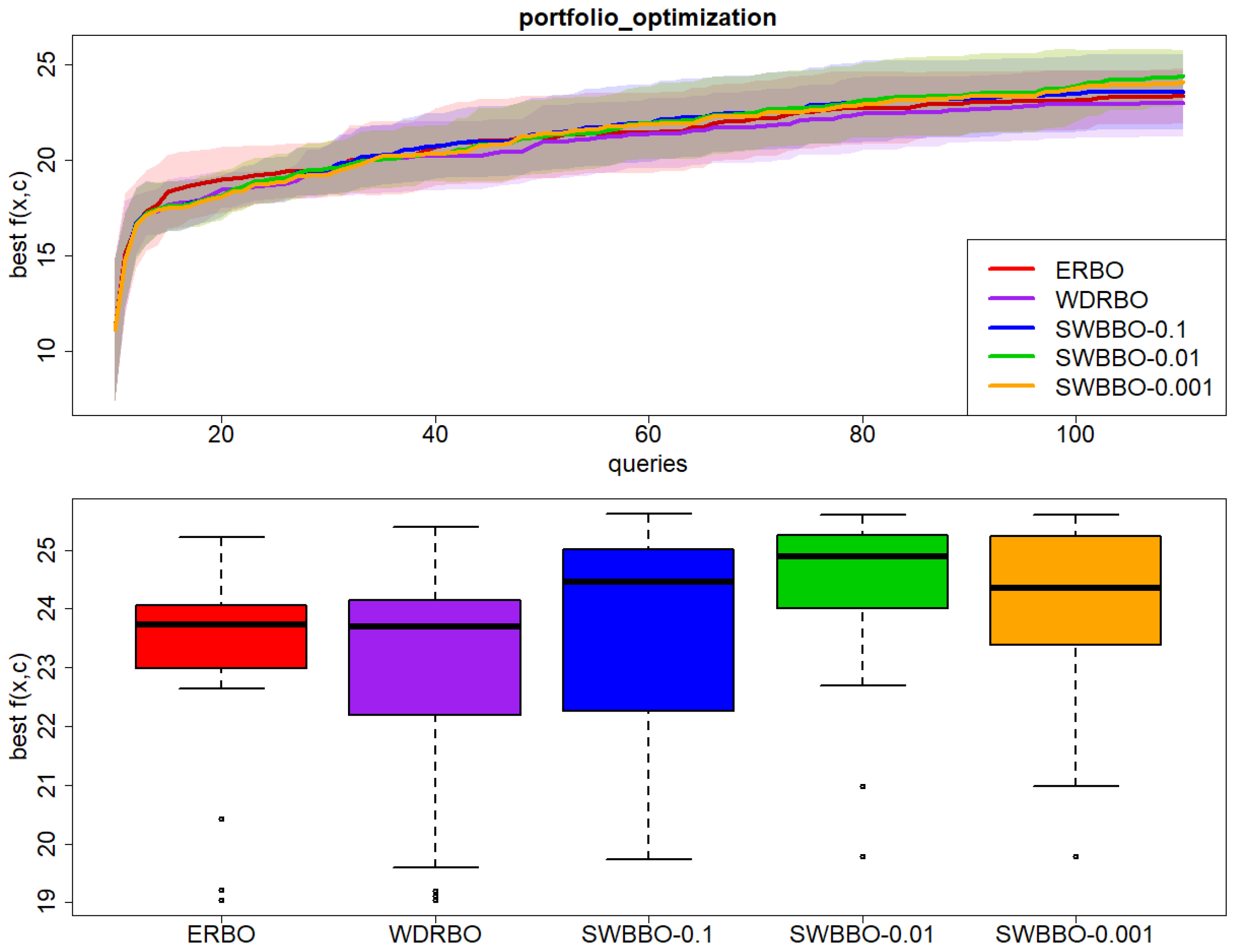 Results on Portfolio_Optimization over 30 independent runs: (top) best observed value of with respect to BO queries and (bottom) boxplot of the final best value of .