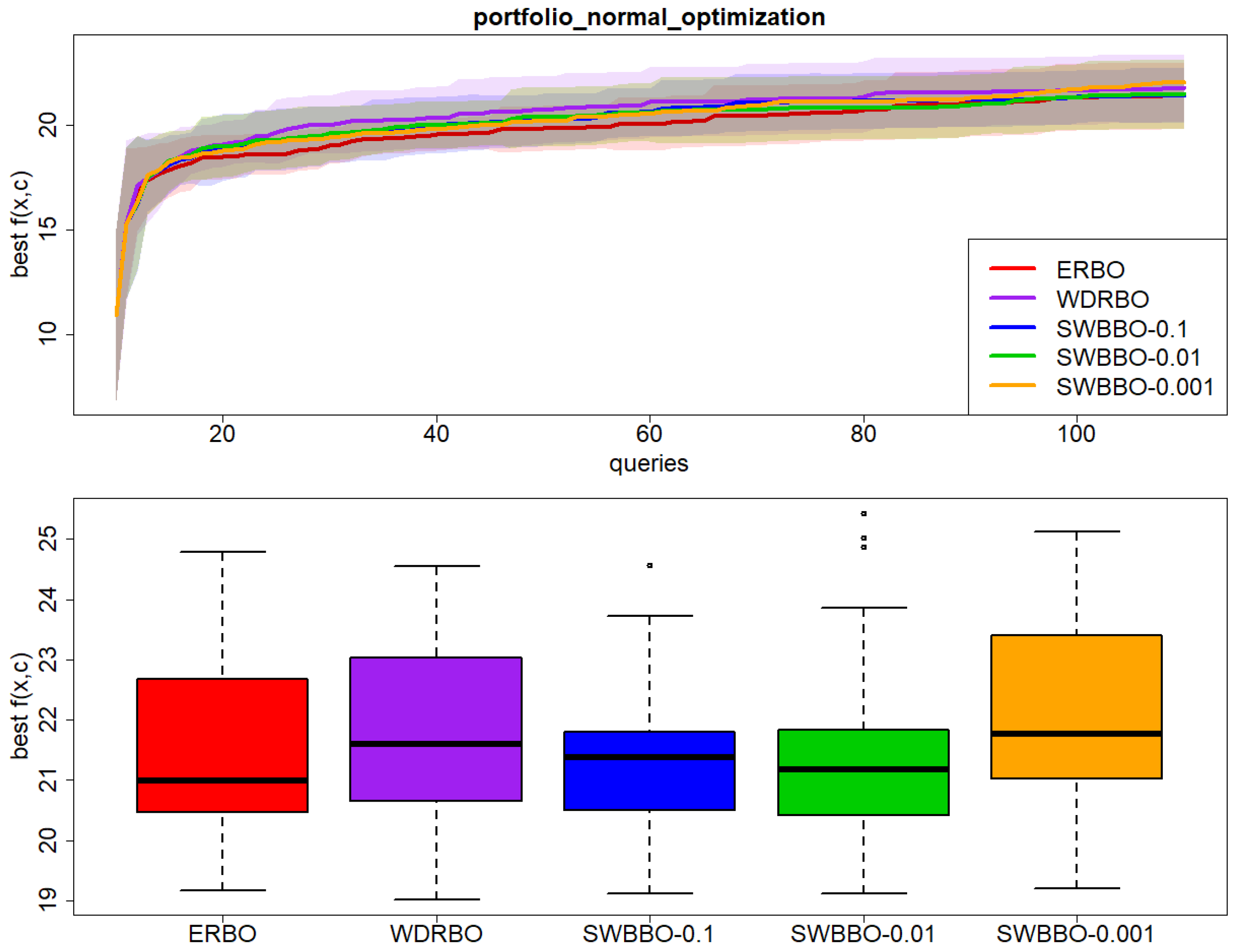 Results on Portfolio_Normal_Optimization over 30 independent runs: (top) best observed value of with respect to BO queries and (bottom) boxplot of the final best value of .