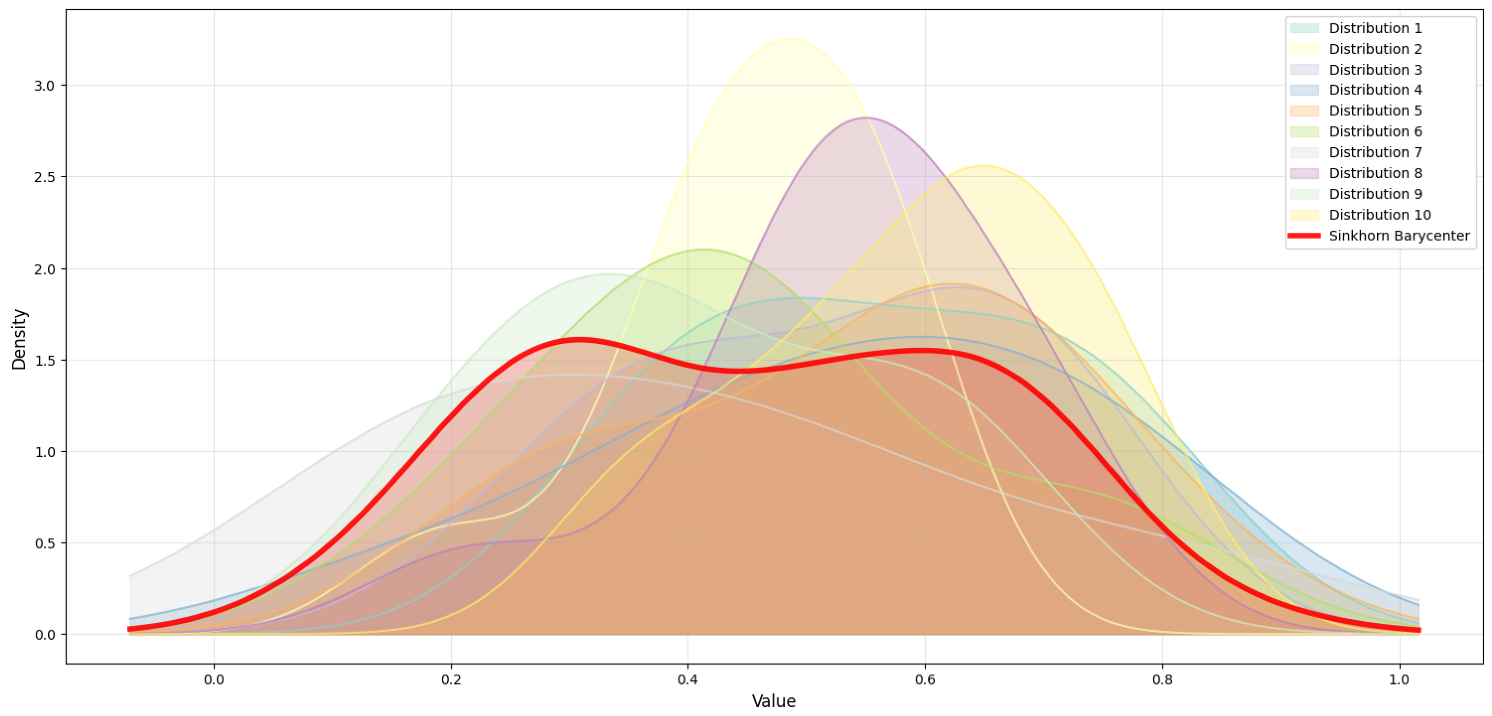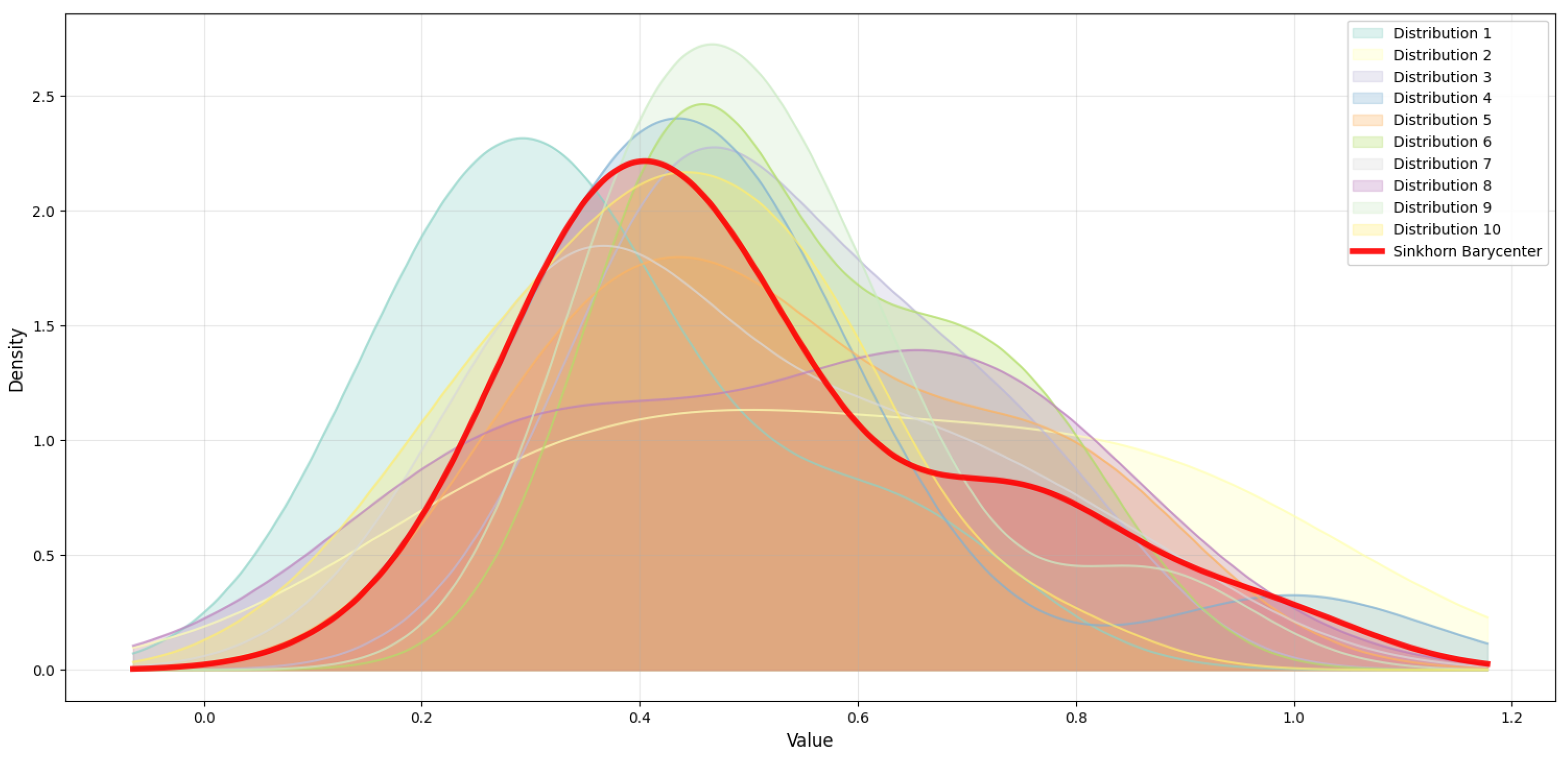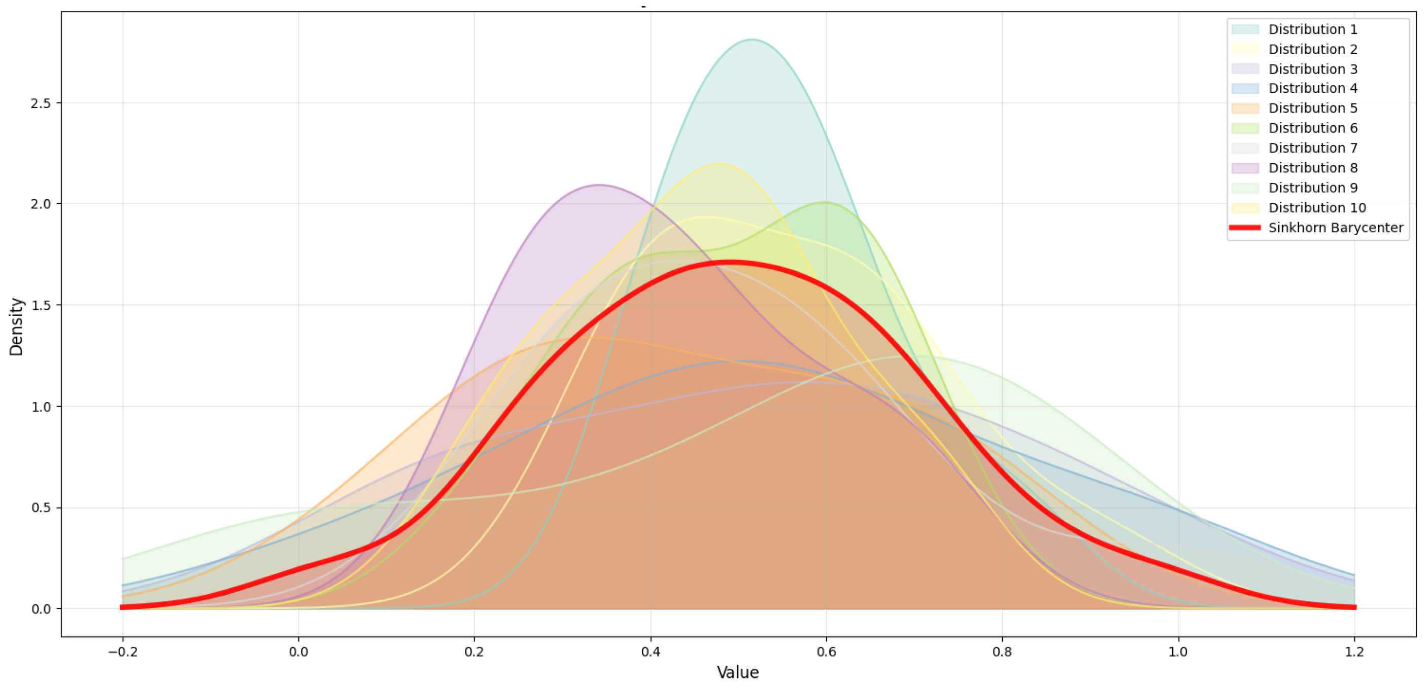 Figure 16 show the Sinkhorn Barycenter among multiple distributions with the computed barycenter highlighted in red, while the odd-numbered