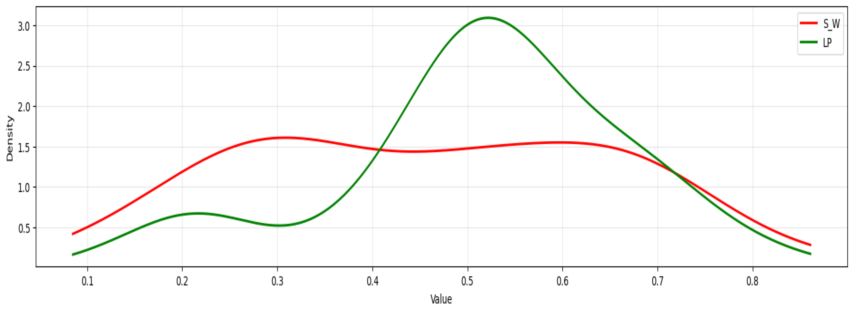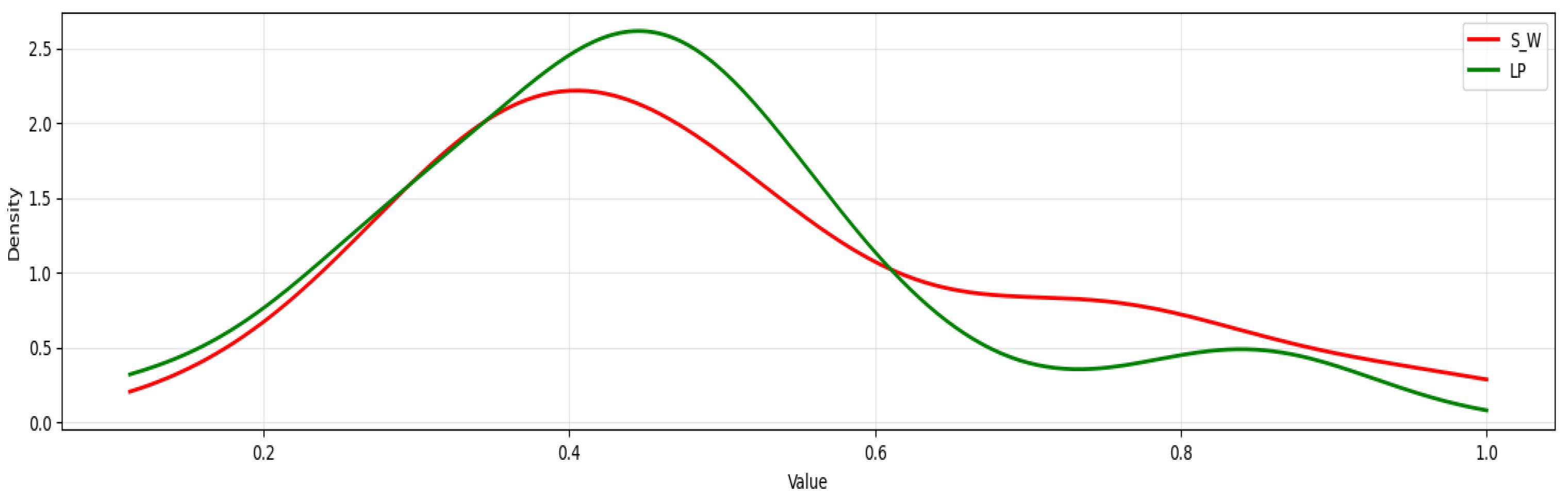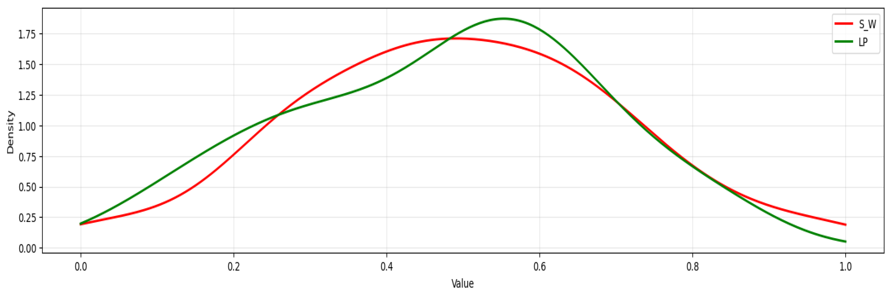 Figure 17 give us direct comparisons between the Sinkhorn–Wasserstein (S-W) method (red curves) and LP method (green curves). The regularization parameter