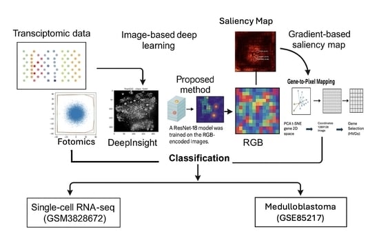 Classifying brain tumour transcriptomic data is crucial for precision medicine but remains challenging due to high dimensionality and limited interpretability of conventional models. This study benchmarks three image-based deep learning approaches, DeepInsight, Fotomics, and a novel saliency-guided convolutional neural network (CNN), for transcriptomic classification. DeepInsight utilises dimensionality reduction to spatially arrange gene features, while Fotomics applies Fourier transforms to encode expression patterns into structured images. The proposed method transforms each single-cell gene expression profile into an RGB image using PCA, UMAP, or t-SNE, enabling CNNs such as ResNet to learn spatially organised molecular features. Gradient-based saliency maps are employed to highlight gene regions most influential in model predictions. Evaluation is conducted on two biologically and technologically different datasets: single-cell RNA-seq from glioblastoma GSM3828672 and bulk microarray data from medulloblastoma GSE85217. Outcomes demonstrate that image-based deep learning methods, particularly those incorporating saliency guidance, provide a robust and interpretable framework for uncovering biologically meaningful patterns in complex high-dimensional omics data. For instance, ResNet-18 achieved the highest accuracy of 97.25% on the GSE85217 dataset and 91.02% on GSM3828672, respectively, outperforming other baseline models across multiple metrics. Full article
