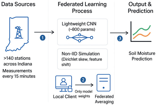 Federated learning (FL) provides a privacy-preserving approach for training machine learning models across distributed datasets; however, its deployment in environmental monitoring remains underexplored. This paper uses the WHIN dataset, comprising 144 weather stations across Indiana, to establish a benchmark for FL in soil [...] Read more.