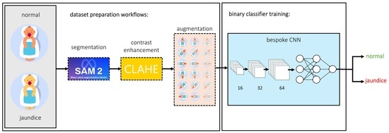 Hyperbilirubinemia, commonly known as jaundice, is a prevalent condition in newborns, primarily arising from alterations in red blood cell metabolism during the first week of life. While conventional diagnostic methods, such as serum analysis and transcutaneous bilirubinometry, are effective, there remains a critical need for robust, non-invasive, image-based diagnostic tools. In this study, we propose a custom-designed convolutional neural network for classifying jaundice in neonatal images. Image preprocessing and segmentation techniques were systematically evaluated. The optimal workflow, which incorporated contrast enhancement and the extraction of regular skin patches of 144 × 144 pixels from regions of interest segmented using the Segment Anything Model, achieved a testing F1-score of 0.80. Beyond performance, this study addresses numerous shortcomings in the existing literature in this area relating to trust, replicability, and transparency. To this end, we employ fair performance metrics that are more robust to class imbalance, a transparent workflow, share source code, and use Gradient-weighted Class Activation Mapping to visualise and quantify the image regions that influence the classifier’s predictions in pursuit of epistemic justification. Full article