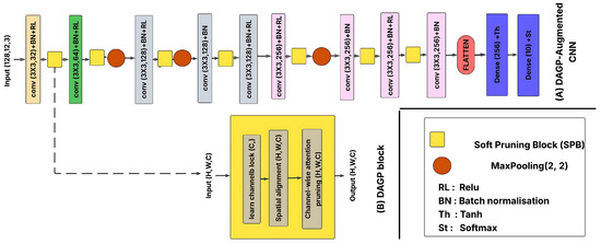 The proposed DAGP (Dynamic Attention-Guided Pruning) framework is modular, lightweight, and architecture-agnostic, enabling seamless integration into diverse CNNs such as VGG-16, ResNet-56, and custom architectures. DAGP is exemplarily integrated into the custom CNN architecture, as illustrated in Figure 3. Its block-wise design allows insertion after any convolutional layer, preserving architectural flexibility without structural modifications. In addition to standard training hyperparameters, DAGP introduces two key pruning-specific controls: the maximum sparsity strength , and the pruning onset epoch , which defers regularization to stabilize early training. Its model-agnostic and task-independent design supports broad applicability across both academic benchmarks and real-world, resource-constrained deployments.