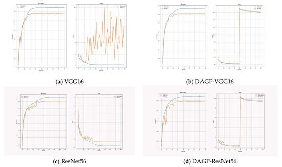 DAGP’s effectiveness extends beyond benchmark settings, demonstrating strong adaptability to task-specific domains such as agricultural disease classification. On the PlantVillage dataset, the DAGP-augmented custom CNN preserves high classification accuracy while enabling substantial compression. As shown in Figure 9b, accuracy and sparsity evolve jointly and remain stable after the warm-up phase, confirming task-driven and consistent pruning dynamics.
