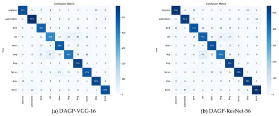 Confusion matrices on CIFAR-10 test set of DAGP-integrated models (VGG-16 and ResNet-56).