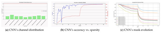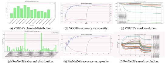 Figure 6, depicting VGG-16 and ResNet-56 on CIFAR-10, shows that global sparsity evolves in tandem with accuracy after the warm-up phase (Figure 6b,e), with the accuracy–sparsity curves remaining stable throughout, showing stable and effective joint optimization of accuracy and sparsity that enables task-guided, accuracy-supervised pruning. This indicates effective regularization and confirms that DAGP maintains performance even under high compression. The curves converge smoothly without instability, achieving final accuracies of 91.30 ± 0.0017% and 91.32 ± 0.0005%, and final global sparsity levels of 93.92% for VGG-16 and 84.28% for ResNet-56, respectively. Moreover, the average mask values per block (Figure 6c,f) converge with high stability to mean values generally below 0.5, indicating effective pruning of a considerable number of channels. Importantly, these values differ across layers, demonstrating adaptive and selective pruning guided by hierarchical feature importance and attention-based selection, achieving a task adaptive sparsity. A notable distinction appears between the two architectures: ResNet-56, with its deeper structure and higher redundancy, exhibits many layers whose masks converge close to zero, effectively eliminating redundant channels, while VGG-16 prunes fewer channels due to its more compact design. This dynamic aligns with the channel retention patterns (Figure 6a,d), where more channels are preserved at low, mid, and high hierarchical stages—supporting rich feature extraction—while intermediate layers are pruned more aggressively to remove redundancy. Together, these findings confirm that DAGP enhances performance and compression simultaneously through attention-guided, selective pruning that reduces overfitting, preserves task-relevant features, and drives stable convergence.