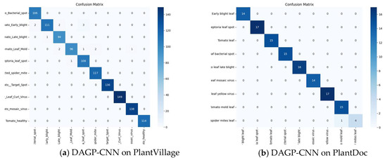 To evaluate DAGP’s effectiveness in task-specific scenarios, we assessed its integration into a custom CNN model on the PlantVillage dataset. As shown in Table 6, DAGP achieves significant reductions in model complexity—over 99.3% in parameters and 98.82% in FLOPs—while improving test accuracy by +1.7% with high stability across multiple runs, demonstrating that it not only compresses but also enhances performance. The strong classification capability of the model is further demonstrated by the confusion matrix in Figure 8a. These results confirm DAGP’s ability to act as an implicit, end-to-end attention-driven optimization mechanism, enabling compact and accurate models without additional tuning.
