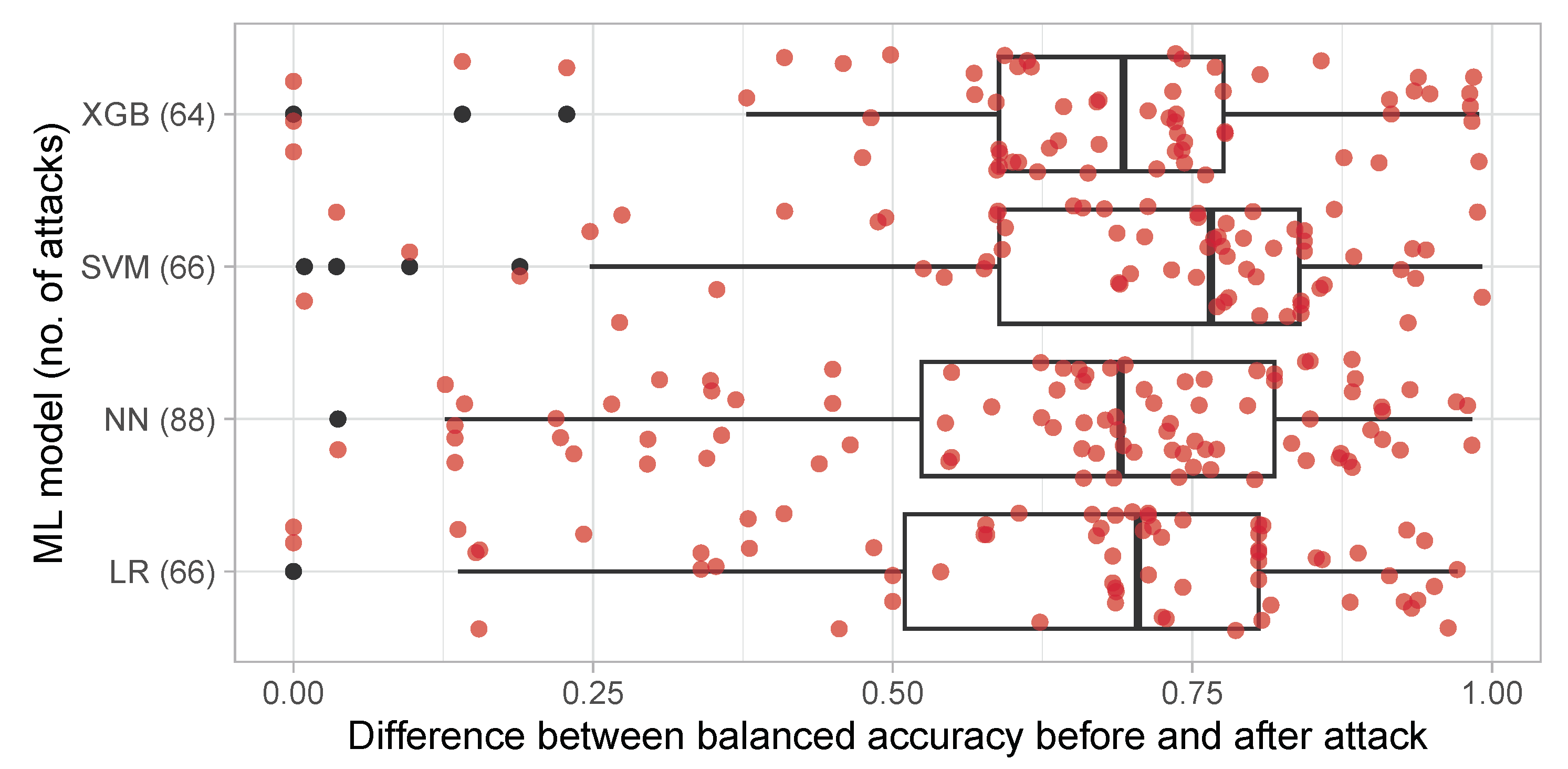 Figure 1 presents values of balanced accuracy difference between original datasets and those after adversarial attack. It can be seen that the median value of deterioration is about 0.7 in absolute value. There are also some single datasets for which conducting an attack results in no effect (the difference is equal to 0).