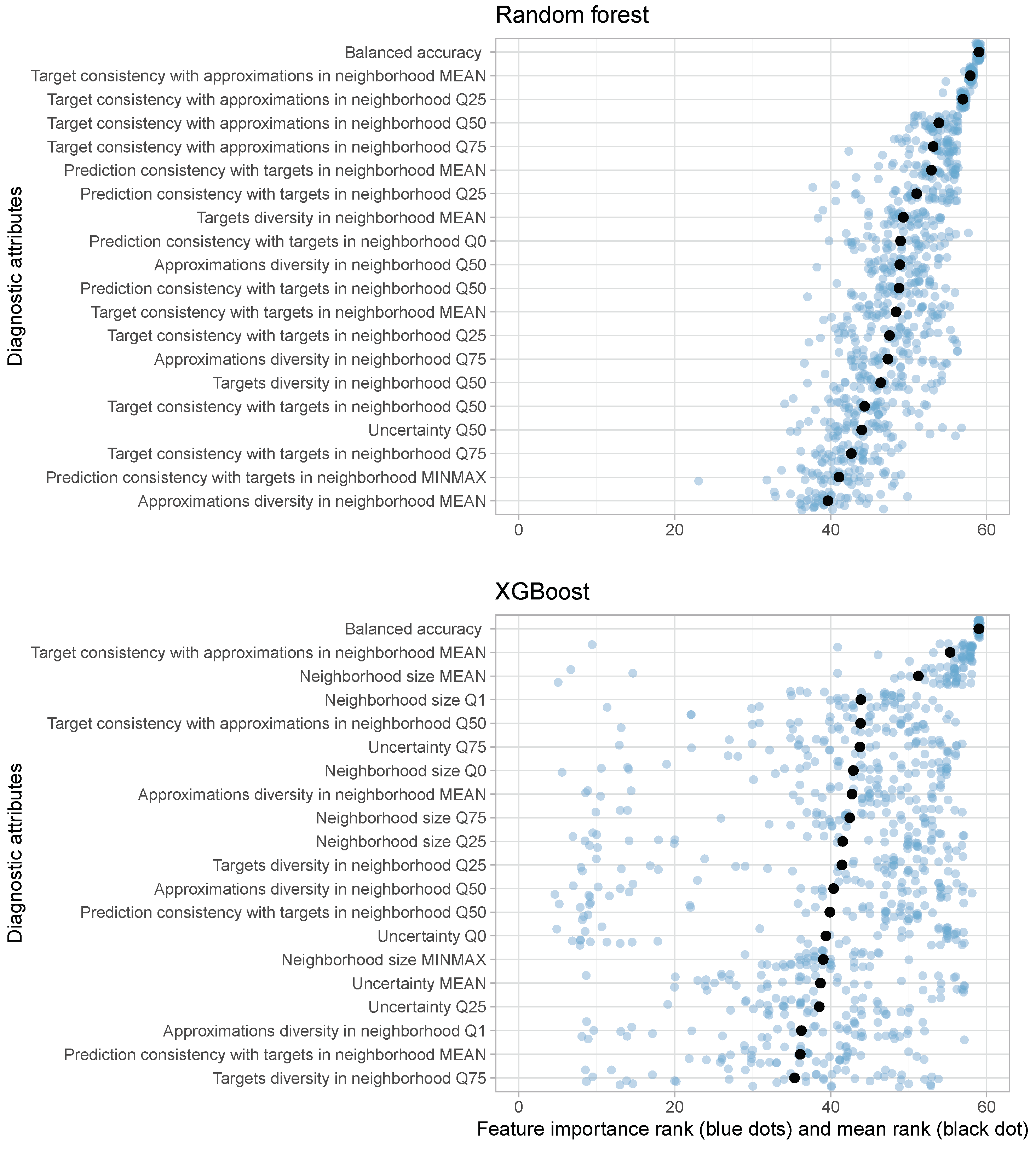 In the analysis conducted on the importance of diagnostic attributes for both types of classifiers, the balanced accuracy set plays a key role. For the random forest classifier, the next positions are occupied by features related to the diagnostic attribute target consistency with approximations, while for XGBoost, the positions are occupied by features related to target consistency with approximations and neighborhood size.