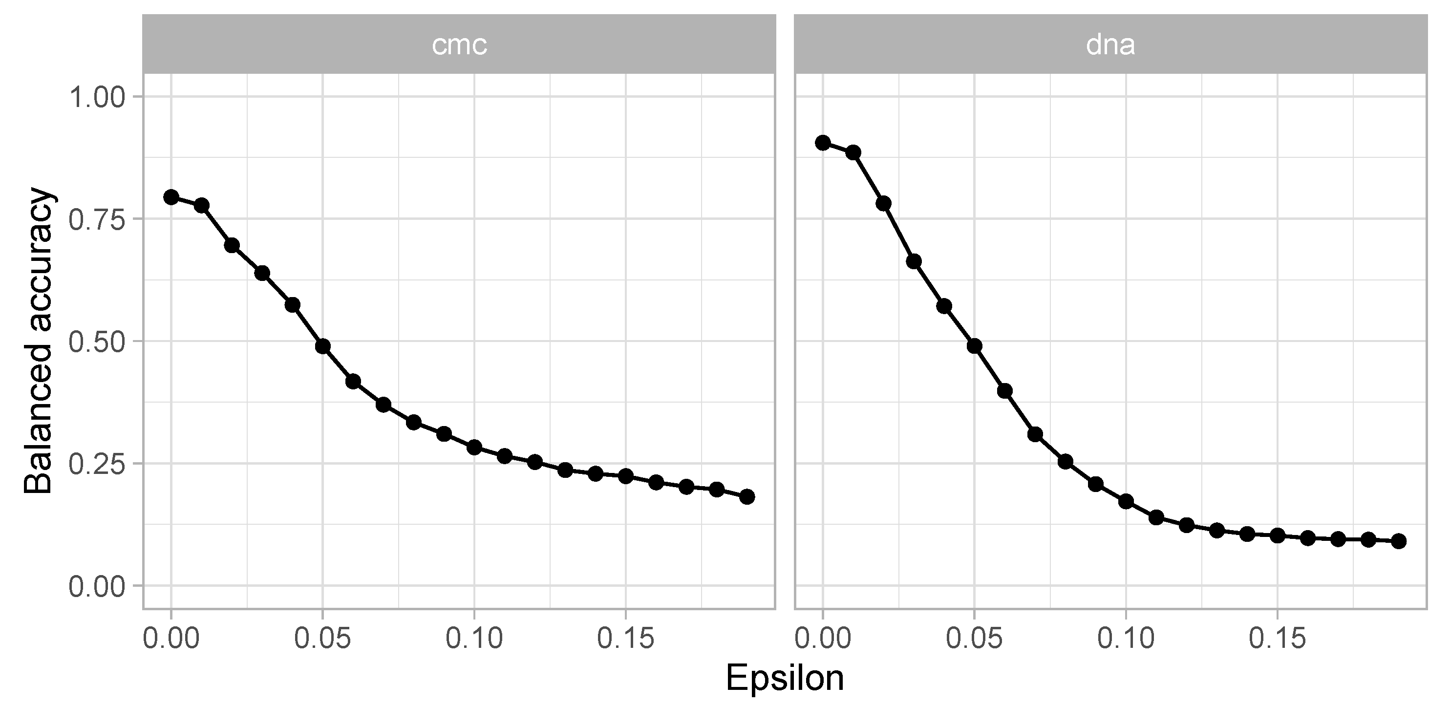 To test the dependence of the attack’s effectiveness on its magnitude, a sensitivity analysis was conducted to check how the balanced accuracy measure changes depending on the
