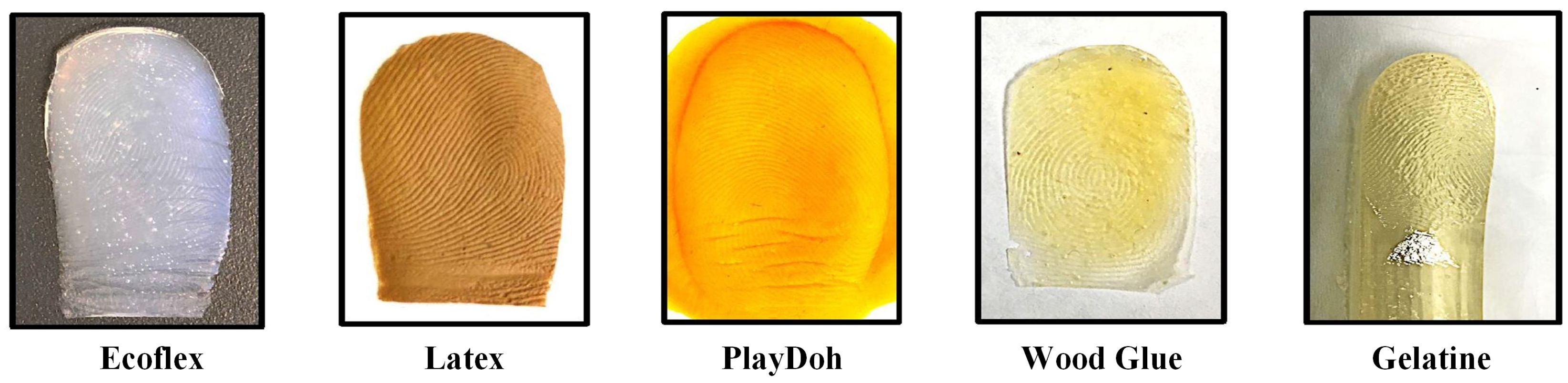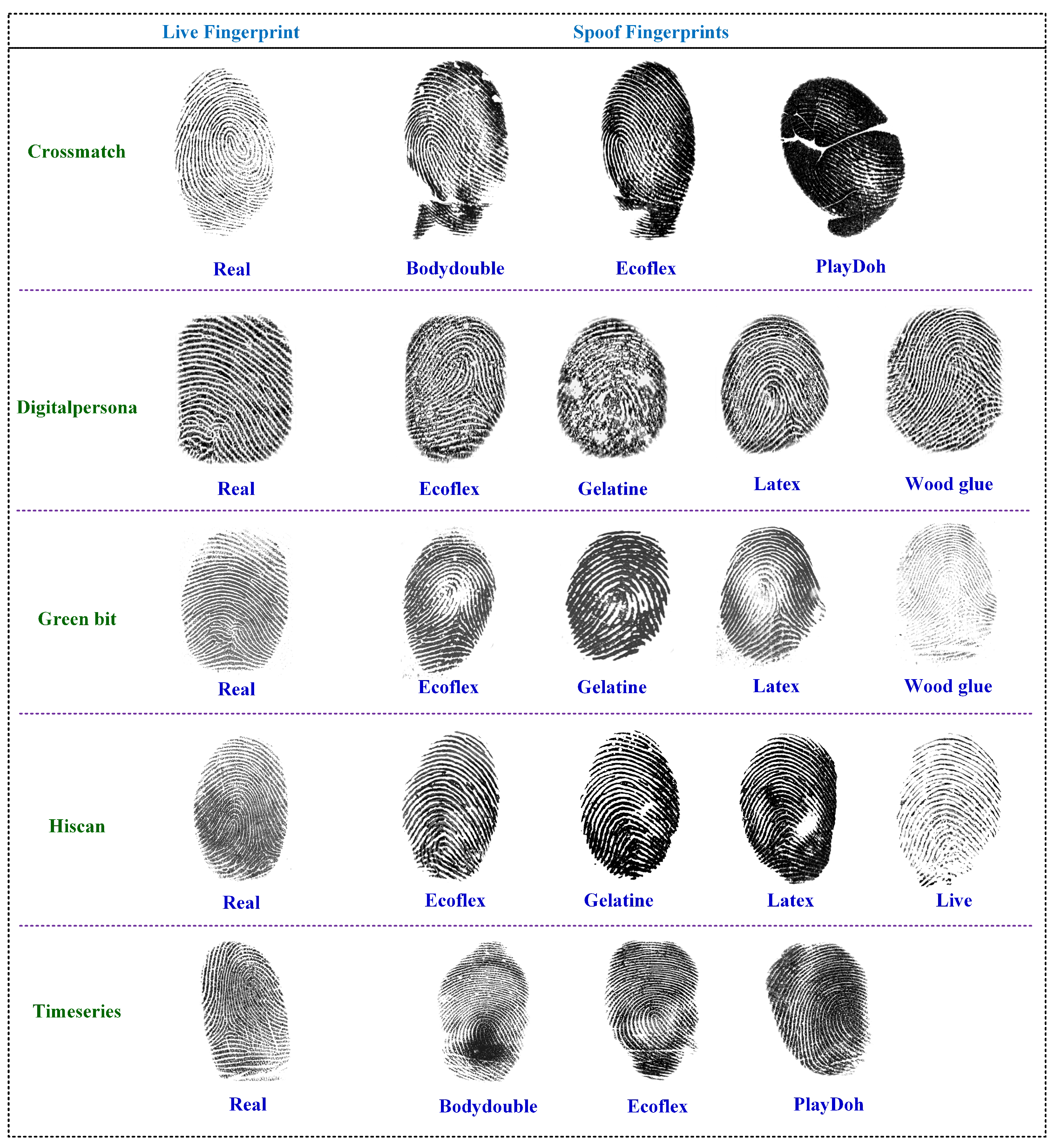 Figure 2). Moreover, unknown spoof materials were contained in the test set to estimate the generalization capability of detection models. Live fingerprint images were received from multiple subjects under differing conditions, including normal, wet, dry, high-pressure, and low-pressure environments.