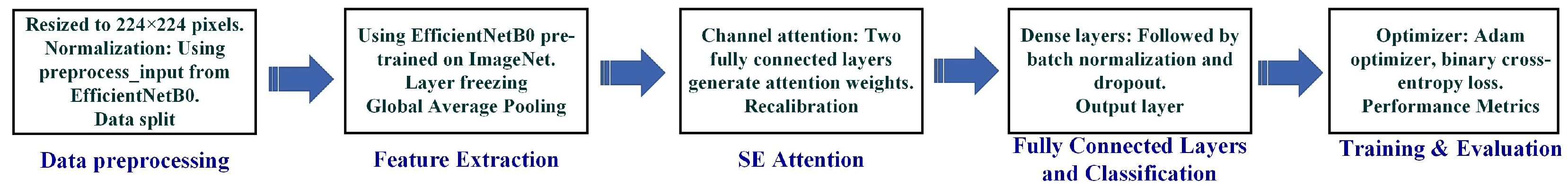, normalization, with 80:20, 70:15:15, 70:20:10 splits). Feature extraction employs EfficientNetB0 with frozen layers and global average pooling. The Squeeze-and-Excitation mechanism applies channel attention through two fully connected layers. Fully connected layers with batch normalization and dropout are followed by a sigmoid output layer for binary classification. The model is trained with the Adam optimizer and binary cross-entropy loss, evaluated employing metrics like accuracy, AUC, precision, recall, and F1-score.