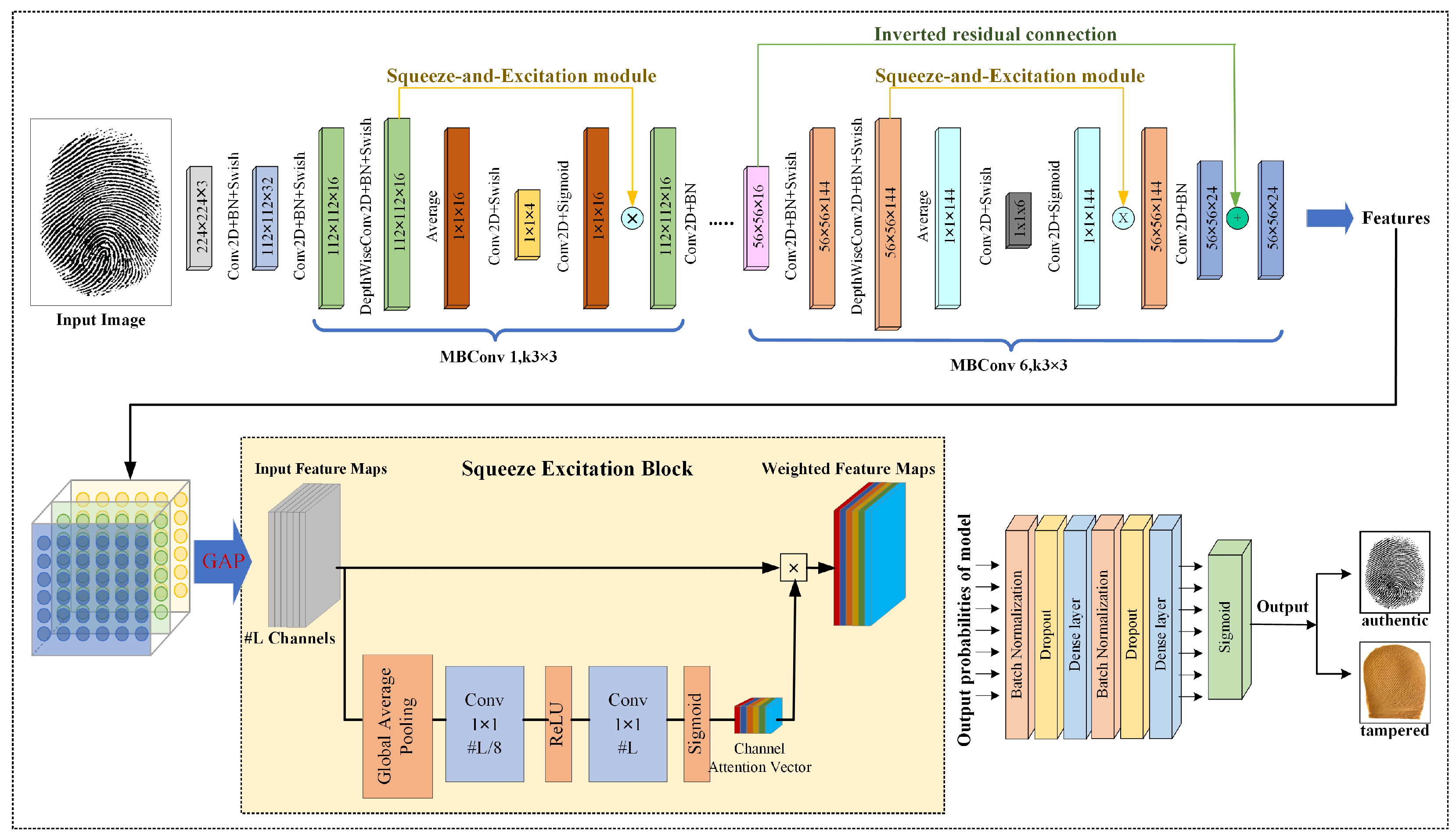 Figure 4 presents an overview of the proposed fingerprint liveness detection methodology, integrating an EfficientNet-inspired structure with Squeeze-and-Excitation (SE) modules and Mobile Inverted Bottleneck Convolution (MBConv) blocks for effective and discriminative feature extraction. The pipeline initiates with a fingerprint image of size