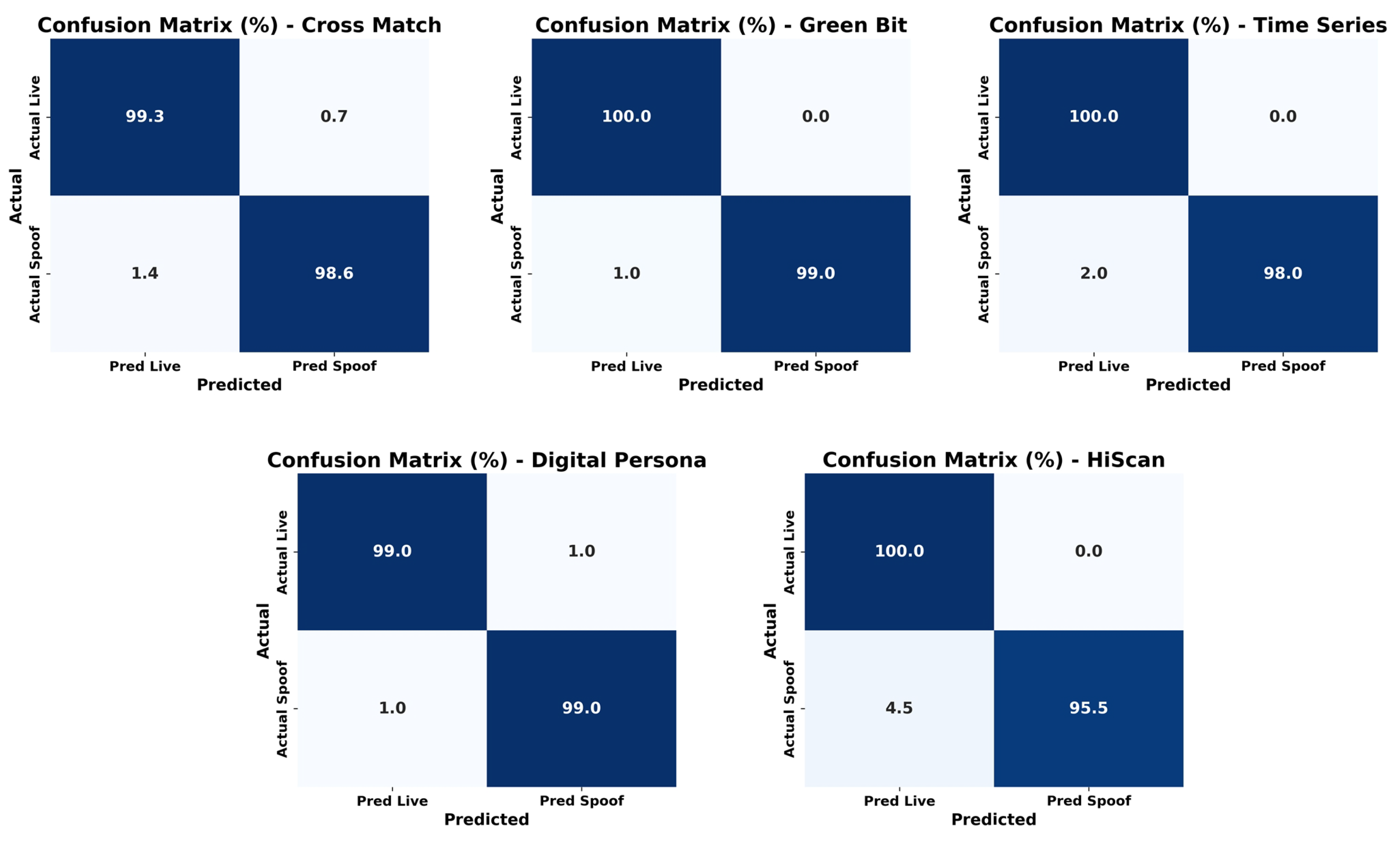 The proposed model is tested on the LivDet 2015 dataset across distinct sensors like Green Bit, CrossMatch, and HiScan, consistently delivering high accuracy and adaptability making the model feasible for real-world applications where sensor diversity is common.
