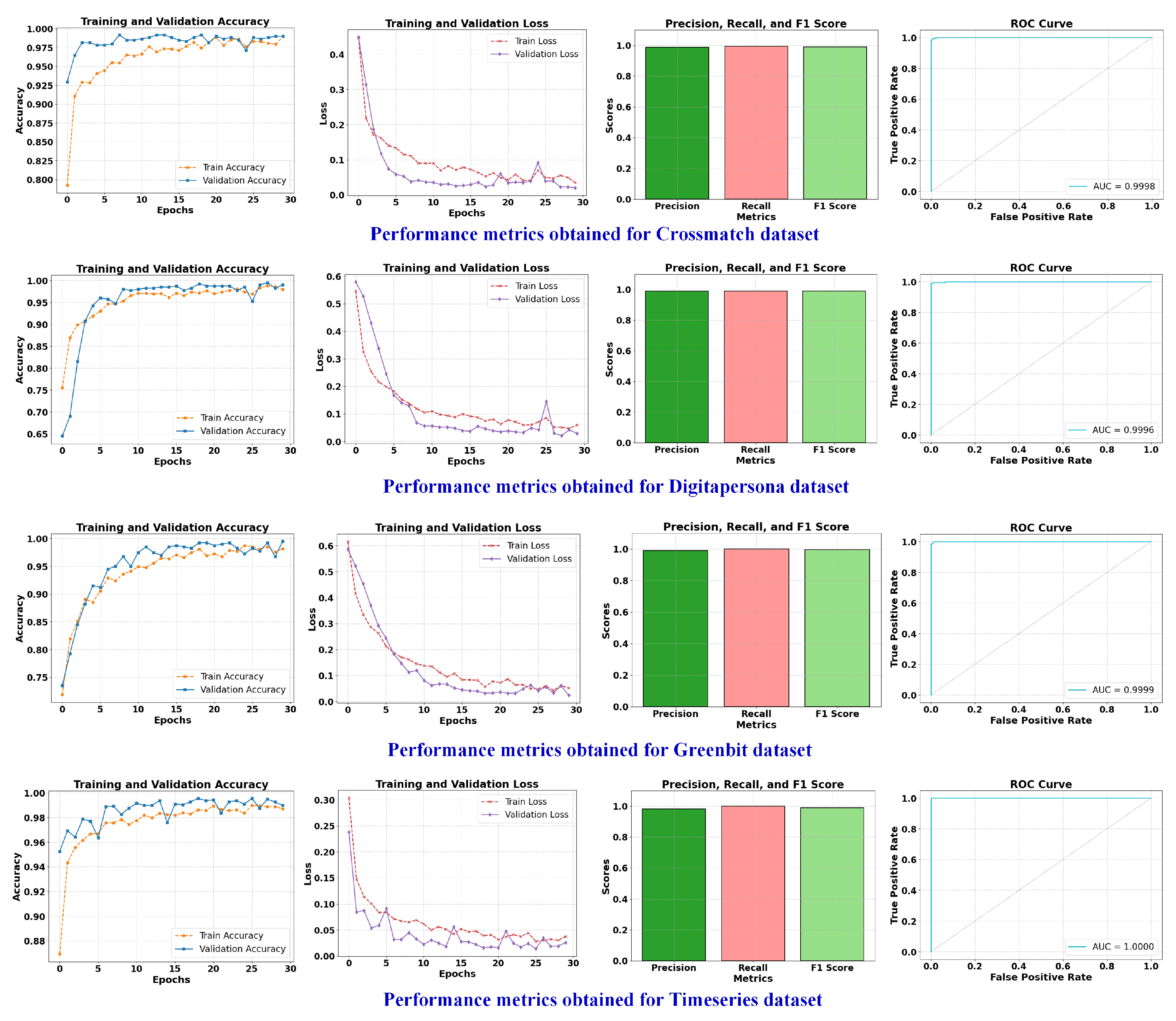 Gaining greater than 98.50% accuracy, high AUC, and perfect recall, the model provides accurate liveness detection with fewer false positives or negatives, essential for preserving secure and seamless user experiences in biometric systems.