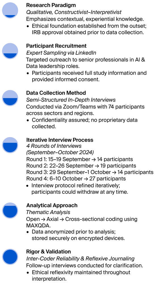 The selected sample size of 74 participants is considered substantial for an expert-based qualitative study and exceeds the typical range found in similar research involving elite or professional informants. While many qualitative studies reach thematic saturation with 12 to 30 participants—particularly when the population is relatively homogeneous [,,]—larger samples are increasingly warranted in studies addressing complex, interdisciplinary, and globally distributed phenomena. In management and organizational research, for example, sample sizes of 50 or more have been effectively employed to capture variation across sectors, roles, and institutional contexts [,]. In the context of this study, the inclusion of a larger and more diverse pool of senior professionals was essential to ensure the collection of rich, multilayered insights into the evolving and multifaceted landscape of AI and data science—particularly in relation to data governance, regulatory adaptation, and model deployment. This approach aligns with recent methodological recommendations in qualitative research that emphasize maximizing variation and enhancing trustworthiness when investigating global domains [].