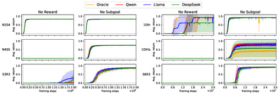 Although DeepSeek generally exhibits the lowest subgoal accuracy across environments, as shown in Table 3, an intriguing exception arises in KeyCorridorS6R3 for representation- and language-based subgoals. Based on the data, DeepSeek does not always select the optimal subgoal, but in KeyCorridorS6R3, the environment’s larger size means that incorrect subgoals often lie closer to the agent’s current position. We hypothesize that this behavior can actually benefit learning: by offering intermediate waypoints that are easier for the agent to reach, DeepSeek effectively facilitates early-stage subgoal-following behavior. Furthermore, this mechanism is moderated by the fact that DeepSeek still proposes optimal subgoals with a non-negligible probability (approximately 75% for this environment and subgoal types, see Table 3), creating a balance between easier-to-reach subgoals and task-aligned subgoals. This combination may explain why, despite overall lower subgoal accuracy, DeepSeek achieves the highest task performance in these specific cases. Experimental results supporting this hypothesis are detailed in Appendix E.